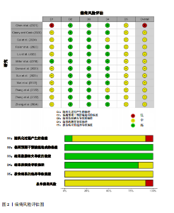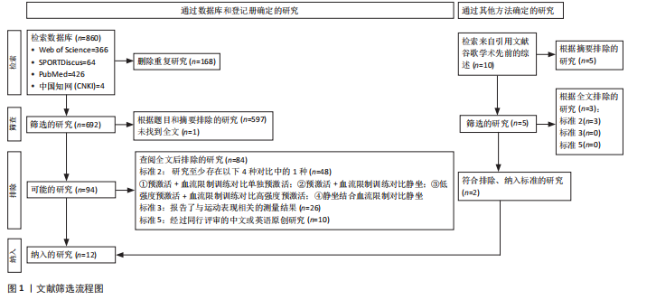 2.1 检索结果 通过制定的检索词共检索到860篇文献。去除重复文献后,剩余692篇文献。经过阅读标题和摘要筛选以及按纳入和排除标准筛选后,剩余10篇文献。此外,通过其他来源(如“ResearchGate”“Google Scholar”等)最终补充了2篇文献。因此,最终符合纳入标准的文献数量为12篇(图1) [25,37-47]。 2.2 纳入研究特征 表2,3提供了纳入研究的受试者参数、热身、预激活、恢复时间、运动表现测试形式和结果。12篇研究共196名受试者,其中女性12名,男性184名;受试者训练水平为身体活跃者1篇,经过训练人群8篇,高水平运动员3篇;年龄为20.3(±0.9)-24(±1.5)岁;身高为1.67(±0.04)-1.85(±0.05) m;体质量为58.4(±7.4)-84.5(±12.1) kg;力量水平为99.5(±10.8)-377.7(±68.2) kg(表2)。5篇研究的血流限制闭塞压通过mmHg测量,5篇通过动脉闭塞压测量,2篇通过收缩压测量;预激活形式包括采用抗阻训练8篇,基于体质量的训练方式4篇;恢复时间为0.25-16 min,测量结果包括,跳跃高度(反向纵跳、下蹲跳、跌落跳、垂直纵跳和立定跳跃)、冲刺时间和卧推投掷高度(表3)。 2.3 偏倚风险 纳入的研究中11篇(91.7%)为存在一些风险,1篇为高风险(8.3%)。仅有1篇报告了随机化的方法,且所有研究均未进行临床的预注册,因此并不清楚是否存在选择性的报告,见图2。"