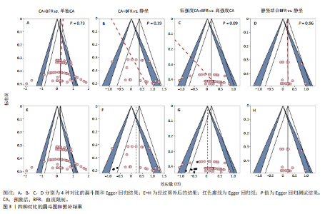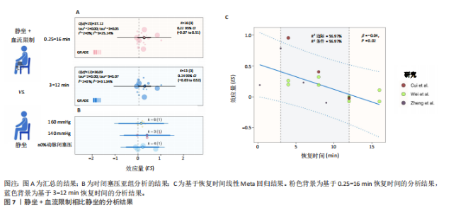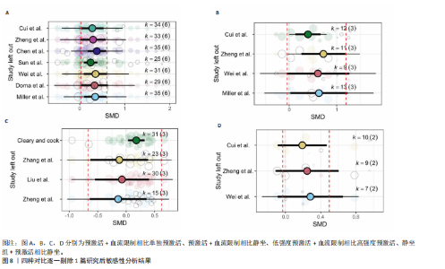 2.4.4 静坐结合血流限制相比静坐 在恢复时间0.25-16 min时,静坐结合血流限制相比静坐对运动表现的急性提升无显著差异(ES=0.22,95%CI=-0.07-0.51,PI=-0.94-1.39,GRADE=低),在恢复3-12 min时结果类似(ES=0.24,95%CI=-0.03-0.52,PI=-1.08-1.56,GRADE=非常低,图7A)。Egger回归检验结果表明不存在显著的发表偏倚风险(P=0.96,图3D和H)。对血流限制闭塞压进行亚组分析发现,结果均不显著(图7B),其他变量也均未发现显著的结果(表7)。 进一步对恢复时间进行线性Meta回归发现,静坐结合血流限制相比静坐对运动表现的效果随着恢复时间显著下降,但预测的所有时间点均无显著意义(R2边际=56.97%,R2条件=56.97%,β=-0.04,P=0.02,图7C)。此外,未发现闭塞压与恢复时间显著的交互作用。 2.5 敏感性分析 剔除1篇高风险研究(CHEN等[40])后,结果没有发生改变(ES=0.31,P=0.01)。对恢复时间3-12 min的汇总结果进行逐一剔除后发现,预激活结合血流限制相比单独预激活的结果稳定,预激活结合血流限制相比静坐剔除CUI等[46](ES=0.39,95%CI=0.13-0.66)、ZHENG等[47](ES=0.72,95%CI=0.26-1.18)和MILLER等[37](ES=0.63,95%CI=0.02-1.23)研究后结果从非显著变为显著。低强度预激活结合血流限制相比高强度预激活剔除CLEARY等[40] (ES=0.18,95%CI=0.03-0.32)研究后结果从非显著变为显著(图8)。静坐结合血流限制相比静坐剔除任意研究后结果均稳定。"