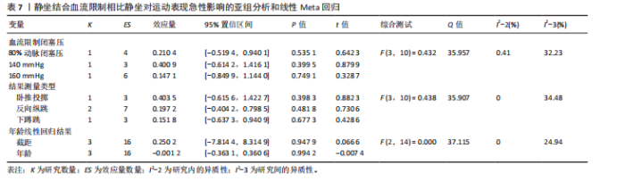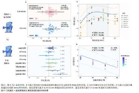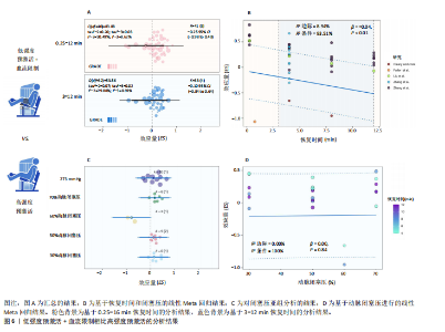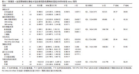 激活展现出更显著的效果(ES=0.21,95%CI=0.01-0.40,PI=-1.49-1.90,GRADE=低),在恢复时间3-12 min时效果类似(ES=0.25,95%CI=0.03-0.46,PI=-0.87-1.36,GRADE=低,图4A)。对血流限制闭塞压进行亚组分析发现,仅在50%动脉闭塞压时比单独预激活更有效(ES=1.49,95%CI=0.57-2.40),且该效果显著大于60%动脉闭塞压(P < 0.01)、70%动脉闭塞压(P < 0.01)、80%动脉闭塞压(P=0.046)、140 mmHg(P=0.03)、149 mmHg(P=0.01)、160 mmHg(P= 0.01)和130%收缩压(P=0.04)闭塞压时的效果(图4C)。此外,其他变量均未显示出统计学显著性(表4)。针对50%-80%动脉闭塞压压力范围的线性Meta回归分析表明,预激活+血流限制对运动表现的提升效果随动脉闭塞压的增加呈递减趋势(R2边际=52.20%,R2条件=94.70%,β=-0.08,P < 0.01;图 4D)。 进一步结合血流限制闭塞压力和恢复时间的多变量非线性Meta回归分析显示,预激活+血流限制的干预效果在4-12 min的时间窗口内最为显著(R2边际=76.26%,R2条件= 76.26%,图4B)。此外,未发现闭塞压与恢复时间显著的交互作用。"
