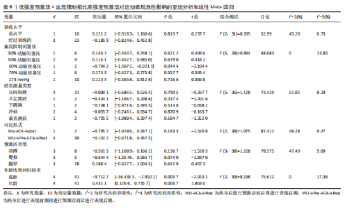 2.4.2 预激活+血流限制相比静坐 在恢复时间0.25-16 min时,预激活+血流限制相较于静坐对运动表现的急性提升无显著差异(ES=0.34,95%CI=-0.27-0.95,PI=-1.14-1.82,GRADE=非常低),在恢复时间3- 12 min时结果类似(ES=0.52,95%CI= -0.12-1.15,PI=-0.78-1.82,GRADE=非常低,图5A)。Egger回归检验结果表明不存在显著的发表偏倚风险(P=0.19,图3B和F)。对血流限制闭塞压进行亚组分析发现,仅在预激活+140 mmHg 血流限制时比单独预激活更有效(ES=1.21,95%CI=0.14-2.28),但相比80%动脉闭塞压(P=0.24)和160 mmHg(P=0.12)并无显著差异(图5B)。此外,其他变量均未显示出统计学显著性(表5)。 进一步结合血流限制闭塞压和恢复时间进行多变量非线性Meta回归发现,预激活+血流限制相比静坐对运动表现的效果随着恢复时间呈现倒U型,但预测的所有时间点均无显著意义(R2边际=67.71%,R2条件=67.71%,图5C)。此外,未发现闭塞压与恢复时间显著的交互作用。 2.4.3 低强度预激活+血流限制相比高强度预激活 在恢复时间0.25-12 min时,低强度预激活+血流限制相比高强度预激活对运动表现的急性提升无显著差异(ES=-0.25,95%CI= -0.98-0.49,PI=-1.77-1.28,GRADE=非常低),在恢复时间3-12 min时效果类似(ES=-0.10,95%CI=-0.84-0.64,PI= -1.33-1.12,GRADE=低,图6A)。Egger回归检验结果表明不存在显著的发表偏倚风险(P=0.09,图3C和G)。对血流限制闭塞压进行亚组分析发现,低强度预激活+60%动脉闭塞压相比高强度预激活显著降低了运动表现(ES=-0.79,95%CI=-1.57至-0.02),但下降的幅度并不比30%动脉闭塞压(P=0.06)、50%动脉闭塞压(P= 0.06)、70%动脉闭塞压(P=0.052)和273 mmHg(P=0.08)更大(图6C)。单独对30%-70%动脉闭塞压进行线性Meta回归并未发现显著结果(R2边际=0.00%,R2条件=100.00%,β=0.00,P=0.84,图6D)。此外,其他变量均未显示出统计学显著性(表6)。 进一步对恢复时间进行线性Meta回归发现,低强度预激活+血流限制相比高强度预激活的效果随着时间显著下降(R2边际=8.94%,R2条件=93.51%,β=-0.04,P < 0.01,图6B)。此外,未发现闭塞压与恢复时间显著的交互作用。"