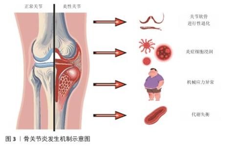 2.1 骨关节炎的发生机制 骨关节主要由关节面、关节囊和关节腔构成,关节腔内还包含韧带和滑液等重要组成部分[7]。流行病学研究显示,骨关节炎的发病率存在显著的性别差异,女性患者多于男性,并且在65岁以上人群中尤为明显[8]。作为一种以关节疼痛、压痛、畸形和功能障碍为主要特征的退行性病变[9],骨关节炎的发生发展与肥胖、关节创伤及遗传因素密切相关[10]。 骨关节炎的发病机制是涉及多因素的复杂病理过程,主要包括关节结构的进行性退化、炎症反应、代谢失衡及机械应力等[11](图3)。骨关节炎的核心表现是关节软骨的进行性退化,表现为软骨细胞外基质中Ⅱ型胶原蛋白和蛋白聚糖的合成减少,从而导致软骨结构破 坏[12]。此外,滑膜组织中炎症细胞浸润及释放的炎性因子进一步加剧软骨分解代谢,并抑制合成代谢过程[13]。在分子层面,软骨细胞中活性氧和活性氮水平异常升高,导致线粒体功能障碍、DNA损伤及细胞凋亡,从而加速软骨退化[14]。软骨下骨重塑是骨关节炎的典型特征,成骨细胞过度活跃会形成骨硬化及骨赘[15],造成关节结构畸形和功能受限[16]。代谢失衡影响软骨细胞能量稳态,局部氧化应激环境持续促进细胞凋亡与细胞外基质降解[17-18],最终形成恶性循环。 "