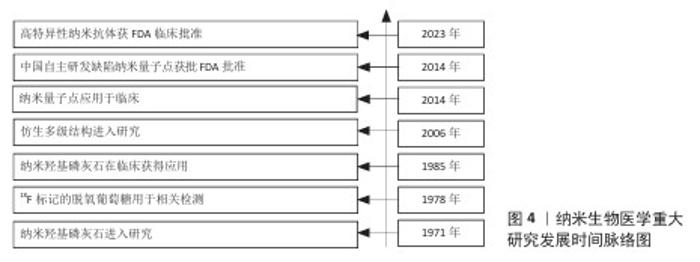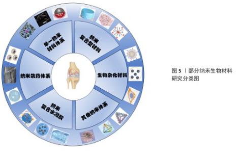 2.2 骨关节炎的治疗方法 骨关节炎的传统治疗手段主要包括保守治疗和手术治疗两大类,二者协同构成了基于病因、疾病严重程度及影像学分级的阶梯化治疗方案。目前,临床药物治疗为保守治疗的核心,常用药物包括非类固醇抗炎药和皮质类固醇等。在疾病早期的治疗策略以保守干预为主,通过减少关节负荷、口服氨基葡萄糖及非类固醇抗炎药[19],同时联合物理治疗以有效控制症状[20]。当病情进展至中期,患者可采用支具固定或关节内注射治疗[21-22],旨在减轻滑膜炎症及降低机械性损伤。而对于晚期骨关节炎患者,由于关节结构已遭受严重破坏,手术治疗便成为必要手段,常见术式包括关节镜下清理术[23]、截骨术或关节置换术[24-25]。值得注意的是,在整个治疗过程中,肥胖患者的体质量管理将影响治疗全程[26]。 2.3 骨关节炎传统治疗方法的不足 在骨关节炎的保守治疗方法中,非类固醇抗炎药有明显的不良反应,涉及胃肠道、心脑血管等方面[27-28]。长期使用皮质类固醇则可能会导致骨质疏松症、高血压、糖尿病等并发症[29]。此外,该类药物口服时易被肝脏和血浆清除,为达到有效的血液药物浓度往往需要加大剂量,这进一步增加了不良反应风险。骨关节炎的手术治疗方面,常见的关节镜下清理术和关节置换术等虽能有效恢复关节功能,但却存在手术创伤大、术后康复周期长等问题[30],不仅增加了患者的生理痛苦,还带来了沉重的心理压力与经济负担。即便采用关节腔原位注射药物的保守治疗方式,仍面临药物易降解、作用时间短和不良反应大等诸多难题[31-32]。于是科研工作者们将纳米生物材料引入了关节炎治疗的基础研究当中,通过对不同的纳米材料体系、搭载的药物和响应机制进行探索,力求突破现有的治疗困境。 2.4 纳米生物医学用于骨关节炎治疗 目前纳米生物医学的研究进展正在不断更新,其中纳米生物材料更是成为当前骨关节炎治疗的主流研究方向。如图4所示,目前纳米生物材料的研究正在各个领域展开,经历了几十年的发展,在骨关节炎的治疗上也取得令人瞩目的进展。从目前的研究成果来看,单一纳米体系、纳米复合型材料、纳米载药体系、生物杂化材料、纳米复合水凝胶和其他纳米体系具备良好的生物相容性(图5)[33-35],可通过表面功能化修饰实现不同条件下的响应性释放,显著延长药物滞留时间,减少注射频次,降低器官毒副作用。例如,负载糖皮质激素的聚乳酸-羟基乙酸共聚物纳米粒可规避肝脏首过效应[36],提升局部药物浓度,减少全身相关不良反应;温敏性壳聚糖水凝胶能在关节腔生理温度下形成原位凝胶[37],持续释放玻璃酸钠,改善软骨润滑功能;此外,纳米载药体系还可特异性富集于炎症滑膜组织[38],实现药物精准递送,减少对正常组织的损伤,纳米材料本身的可控降解行为进一步提升了其生物安全性。 "