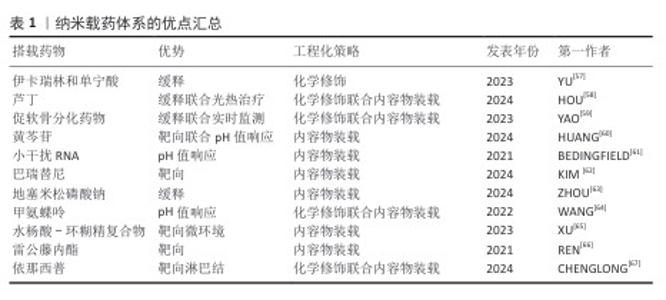 2.4.3 纳米载药体系 如表1所示,新型的纳米载药体系同时兼具多种优点,例如增加药物递送的准确性、提高药物的稳定性、可控释放药物和降低生物毒性作用。YU等[57]将伊卡瑞林与单宁酸共同锚定于纳米颗粒表面,实现对骨关节炎的协同治疗,体外实验表明该体系可显著抑制基质金属蛋白酶3和环氧化酶2等促炎因子表达;体内实验进一步证实该材料有效缓解了大鼠模型的软骨退化与关节结构破坏。水凝胶用于药物的搭载释放一直是人们关注的研究方向,它通过调控药物物理状态或载体结构实现药物的长效释放,满足关节内治疗对持续药效的需求。HOU等[58]由此开发了一种独特且创新的治疗平台,这种载药体系通过将药物芦丁掺入黑磷纳米片中,再整合到透明质酸和聚乙烯醇基质中以形成纳米载药水凝胶,利用光热转换效应实现了近红外照射下的光热疗法,并与抗炎药物实现了协同治疗。这样的组合方式显著增强了原有药物的治疗效果,而且可以借助外源动力实现协同治疗。YAO等[59]通过点击化学将聚乙二醇、促软骨分化药物Kartogenin、润滑剂氢化大豆磷脂酰胆碱及荧光素结合于载药平台,构建了兼具荧光可视化、润滑与药物缓释功能的多功能载药体系,再利用微流控技术将其封装于透明质酸甲基丙烯酸酯水凝胶微球中,借助荧光信号可以实时监测软骨修复进程。同时,具备靶向性的纳米载药体系取得很大的研究进展,通过材料修饰或机制设计实现对病变部位的精准识别与药物释放,增强局部疗效的同时还减少了全身不良反应。HUANG等[60]利用叶酸特异性结合骨关节炎中M1型巨噬细胞表面过表达的叶酸受体β,将中药黄芩苷负载于金属有机框架合成纳米载药体系,借助独特的高孔隙率和pH值响应性在关节酸性环境中缓释药物,同时通过清除活性氧和调控巨噬细胞向M2方向极化缓解滑膜炎症与软骨退化,显著降低关节活性氧水平并改善软骨结构。 基于炎症条件下相关酶的表达差异,研究者开发了多种靶向递药策略以实现精准治疗。BEDINGFIELD等[61]制备了聚乳酸-羟基乙酸共聚物微米板靶向基质金属蛋白酶13,通过封装的小干扰RNA于pH值响应性纳米颗粒实现了靶向释放小干扰RNA,从而减少软骨降解与滑膜增生。除了酶靶向策略以外,特定的炎性微环境靶向也成为新的研究热点。有研究利用钙依赖膜修复机制实现了非侵入性细胞内靶向递送,利用光穿孔技术结合上转换纳米颗粒与金纳米颗粒,利用上转换纳米颗粒将近红外光转换为可见光激活金纳米颗粒等离子共振效应,在骨关节炎模型中靶向胞内高效递送巴瑞替尼,促进了软骨细胞分化及细胞外基质的表达[62]。纳米载药平台的加入弥补了治疗药物水溶性有限、半衰期短和生物利用度低等不足,这样的策略在纳米复合型材料的研究中具有深远的指导意义。 对于具体的机制通路研究中,ZHOU等[63]开发了一种抗炎超分子纳米纤维水凝胶(HAS2@DexP-Gel),通过负载编码透明质酸合成酶2的慢病毒和地塞米松磷酸钠将基因治疗与抗炎药物结合,该缓释系统显著延长了药物与病毒的作用时间,通过单细胞RNA测序证实该体系可调节滑膜成纤维细胞亚群比例、促进M2型巨噬细胞极化,并抑制磷脂酰肌醇3-激酶等信号通路,从而改善滑膜炎症微环境。WANG等[64]将甲氨蝶呤负载于乙酰化葡聚糖分子中构建了具有靶向性和pH值响应性的纳米药物系统,不仅降低了甲氨蝶呤的全身毒性,还增强其治疗效能,该体系可在炎症部位富集并释放药物,通过调节激酶信号传导与激活转录蛋白通路延缓骨关节炎的进展。在与中医学领域的结合研究中,XU等[65]创新性地将传统针灸与纳米递送结合,在针灸针表面修饰甲基水杨酸-环糊精复合物,靶向骨关节炎局部微环境,通过调节高迁移蛋白1表达的信号通路和抑制鸟苷三磷酸水解酶活性有效缓解疼痛并延缓软骨退化,验证了纳米药物和针灸协同治疗的潜力。REN等[66]构建了可靶向递送抗炎药并模拟针灸缓解疼痛的穴位给药系统,由雷公藤内酯、环戊基腺苷和人血清白蛋白纳米颗粒组成,相关实验结果表明此体系可特异性增强穴位镇痛效果,还可以调节炎症因子、恢复T细胞免疫的平衡,拥有更好的治疗效果和更低的药物毒性。此外,CHENGLONG等[67]利用依那西普竞争性抑制肿瘤坏死因子α与受体的结合,在炎症关键部位激发免疫调节反应,为关节炎治疗提供了新策略。随着纳米载药体系研究的深入,它在骨关节炎治疗上的应用价值正从单一药物递送平台向多功能治疗系统升级,从靶向递送、智能响应、协同治疗等多维度展开,既体现研究深度又衔接临床转化。 "