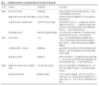 2.4.4 生物杂化材料 生物杂化材料是由生物材料与合成材料通过物理、化学或生物方法结合而成,兼具两者优势,其中包含细胞外泌体(细胞和细菌等来源,表2)和细胞疗法等,生物杂化材料不仅可以作为高效且精准的药物递送体系,还能经过工程化改造后为关节组织的再生治疗提供更多选择,在关节炎治疗领域展现出广阔前景。在脂质材料外泌体的研究中,通过化学修饰和装载内容物等方法进行功能的附加应用于骨关节炎治疗,例如,TANG等[68]提出了一种新型的固有抗炎外泌体,通过电穿孔法整合小鼠单核巨噬细胞衍生的外泌体和强大的抗炎免疫调节剂白细胞介素10,使用无创超声来增加该体系对血管的通透性,从而促进巨噬细胞极化为M2表型,其中抗炎和促消炎的联合机制为治疗骨关节炎和其他炎症性疾病提供了独特的见解。YANG等[69]利用改性天然多糖、透明质酸和硫酸软骨素组成微载体、改性的间充质干细胞外泌体作为搭载平台,内部封装的磁性纳米粒子能够捕获干细胞外泌体和封装药物双氯芬酸钠,微载体释放的双氯芬酸钠和外泌体在缓解骨关节炎症状和促进软骨修复方面展现了强大的协同治疗能力。YANG 等[70]探讨人脐带间充质干细胞分泌外泌体对骨关节炎大鼠模型的治疗作用,发现人脐带间充质干细胞外泌体促进骨关节炎大鼠的软骨再生,并且该组中滑液细胞因子、肿瘤坏死因子α、白细胞介素1β和白细胞介素6的水平均低于对照组;对于白细胞介素1β刺激的软骨细胞,外泌体处理可显著下调细胞中基质金属蛋白酶13和血小板反应蛋白解整合素金属肽酶5的表达、上调Ⅱ型胶原的表达。MENG等[71]研究脂肪组织来源基质细胞外泌体在骨关节炎治疗中的作用,发现软骨细胞与脂肪组织来源的基质细胞均可分泌外泌体,脂肪组织来源的基质细胞衍生外泌体可被软骨细胞吸收,而且相比软骨细胞外泌体可以分泌更高水平的微小RNA-429,通过荧光素酶测定证明微小RNA-429直接靶向束缚和伸长蛋白进而激活自噬通路,从而改善软骨损伤。 除动物细胞来源的外泌体外,植物源性外泌体同样成为骨关节炎治疗的研究热点。LIU等[72]从大蒜中提取出一种纳米颗粒,它的主要成分为大蒜衍生的外泌体样结构,体外实验表明该外泌体可显著促进Ⅱ型胶原和聚集蛋白聚糖的表达、抑制基质金属蛋白酶3和基质金属蛋白酶9的表达,机制研究进一步揭示该外泌体能够抑制丝裂原活化蛋白激酶的磷酸化,从而减轻软骨降解。LIANG等[73]从光螺旋藻中提取了细胞外泌体,为了促进细胞外泌体的持续递送,使用大黄酸水凝胶系统进行关节内注射,该体系在弱酸性条件下表现出pH值响应性和协同抗炎作用,减缓了炎症介导的氧化应激状态,并恢复软骨细胞中的线粒体膜电位,通过调节Janus激酶-信号传导和转录激活蛋白通路发挥协同抗炎作用。RASHIDI等[74]巧妙地从葡萄柚汁中分离外泌体作为骨关节炎新治疗方法,一方面,抑制环氧化酶 2、前列腺素内过氧化物合酶 2等炎症标志物表达,降低疼痛敏感性;另一方面,增强抗氧化基因活性、下调血小板反应蛋白解整合素金属肽酶5和肥厚型胶原表达、上调Ⅱ型胶原等软骨形成标志物表达,实现抗炎与促软骨再生的协同效应。这些研究标志着外泌体用于骨关节炎治疗的重大进步,将为未来研究提供全新的思路。 细菌与真菌来源的外泌体也在骨关节炎研究中展现出潜力。GONG等[75]将大鼠骨髓间充质干细胞与细菌来源的外泌体共培养制备了具有超声成像能力的材料体系,在与甲氨蝶呤的联合治疗进程中可显著增强甲氨蝶呤的疗效,使得关节炎指数评分降低、骨侵蚀和软骨破坏减少。为了寻找新的炎症作用靶点,HONG等[76]将肠道微生物群来源的外泌体注入到关节后其自身毒性引发局部炎症反应,作用于滑膜巨噬细胞后激活参与炎症途径的相关因子以及炎症递质的关键调节因子Y盒结合蛋白1,为临床治疗寻找新型干预靶点提供了选择。值得一提的是,细胞疗法应用于骨关节炎的研究较为成熟,很多研究成果已进入临床使用,例如,AO等[77]对14例接受反复关节内注射间充质干细胞的骨关节炎患者进行了为期3个月的随访评估,所有患者接受干细胞治疗后均表现出膝关节功能受限和疼痛的一定改善,其中有5例(35.7%)出现短暂性不良反应并自行消退。还有研究将10例骨关节炎患者自体骨髓间充质干细胞通过原位注射方法注入受损关节,随访评估发现这是一种安全且有效恢复关节功能和活动范围的治疗方法[78]。CAO等[79]将间充质干细胞注入502例骨关节炎患者的患病关节,同样发现间充质干细胞可以显著改善短期和长期治疗效果,亚组分析显示脂肪来源和高剂量的间充质干细胞疗效更加显著。在此类研究中,生物杂化材料融合细胞、植物及细菌真菌外泌体与细胞疗法等多类材料的优势,在未来基础医学研究与临床实践中发挥多手段治疗的作用,持续推动纳米智能诊疗体系的发展。 "