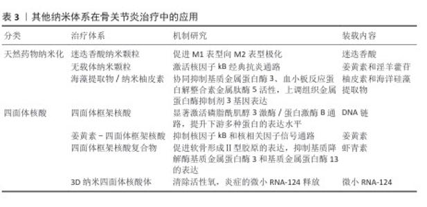 2.4.5 纳米复合水凝胶 纳米复合水凝胶在骨关节炎治疗中可通过多途径发挥作用:一方面,能够优化关节内力学微环境;另一方面,可实现靶向治疗药物的负载,同时还能诱导未分化细胞向软骨方向分化,以此加速软骨修复进程并调节关节内炎性微环境,最终达成治疗骨关节炎的目标。WU等[80]开发了一种臭氧富集的热响应纳米复合水凝胶,该材料通过将臭氧封装于全氟三丁胺与氟化透明质酸构建的纳米颗粒中,并与羟丙基几丁质的α-氨基进行偶联以增强稳定性,体外细胞实验表明该体系可显著降低血管内皮生长因子及白细胞介素1β、白细胞介素6和肿瘤坏死因子α等炎症因子水平,从而减轻滑膜炎症、抑制软骨破坏与软骨下骨异常重塑,有效缓解骨关节炎进展。ZHANG团队[81]设计了一种基于沸石咪唑酯框架8负载槲皮素的可注射水凝胶,该体系具备pH值与活性氧双重响应特性,可实现生物活性物质的控释并调节骨关节微环境,显著减轻滑膜炎性反应与软骨基质降解,促进软骨组织修复。这种开发的热敏可注射水凝胶可有效平衡润滑与生物活性物质的受控释放,代表了一种非常有前途的骨关节炎治疗方法。XU等[82]利用多巴胺中Mg2+与儿茶酚胺键之间的金属螯合作用成功构建了多功能纳米颗粒(DIC/Mg-PDA NPs),然后使用双氯芬酸进行酰胺化,再通过微流控技术制备成具有免疫调节和软骨修复能力的可注射水凝胶微球(DIC/Mg-PDA@HM),该微球可诱导巨噬细胞M1型转化为M2型,激活炎症的免疫治疗,并促进骨髓间充质干细胞的分化以实现软骨再生。在具体的治疗机制探索中,HALOI等[83]以异硫氰酸苯酯为基础制备了壳聚糖/普朗尼克F-127智能水凝胶,性能测试结果证明了该材料体系拥有足够的热敏性,注射入骨关节炎大鼠模型后显著降低了骨关节炎相关症状并激活抗炎活性通路。当前,纳米复合水凝胶在骨关节炎领域的研究仍存在广阔的探索空间,持续推进材料制备工艺的优化,并深入开展细胞水平及动物模型层面的实验研究,有望为骨关节炎的临床治疗开拓新的路径,它独特的理化性质和良好的生物相容性也展现出了在生物医学领域研究中广阔的发展前景。 2.4.6 其他纳米体系 如表3所示,该章节主要讨论天然药物纳米化和四面体核酸的研究进展。在其他类型的纳米体系中,药物纳米化是将天然药物制成纳米级别的颗粒,纳米级别的尺寸让药物具有更大的比表面积,能显著提高药物的溶解速度和生物利用度,使得药物更容易穿透生物膜而被关节组织吸收。LU等[84]报告了一种独特的自组装策略,使用天然存在的多酚基化合物迷迭香酸构建独特的迷迭香酸纳米颗粒,它可促进巨噬细胞从M1表型向M2表型极化,从而抑制骨关节炎的发展。同样的思路,DAI等[85]将姜黄素与淫羊藿苷通过π-π堆积自组装形成无载体纳米颗粒,该材料的pH值响应释放特性在关节腔酸性环境中48 h累积释药率增加,姜黄素的自发荧光可实现体内实时追踪,显著抑制白细胞介素1β诱导的核因子kB典型抗炎通路激活,促进软骨细胞增殖。还有研究通过减小纳米柚皮素粒径至100 nm使其生物可利用度提升,与海洋硅藻提取物协同抑制基质金属蛋白酶3、血小板反应蛋白解整合素金属肽酶5活性、上调组织金属蛋白酶抑制剂3基因表达、减轻滑膜炎症及软骨胶原纤维破坏,效果与临床常用药物吲哚美辛相当,但无明显胃肠道不良反应[86]。 四面体核酸体是一种由4条 DNA 链自组装形成的纳米级核酸结构,具有高度的稳定性和独特的三维纳米结构。特殊结构赋予四面体核酸体多种功能,使它能够作为药物载体,通过表面修饰实现治疗分子的高效负载与靶向递送。FU等[87]提出使用四面体框架核酸(tFNA)作为体外培养环境中管理间充质干细胞行为的新方法,结合生物信息学方法探究了四面体框架核酸对间充质干细胞增殖、迁移和成软骨分化的影响,实验结果显示磷脂酰肌醇3激酶/蛋白激酶B通路被显著激活,提升了下游多种蛋白的表达水平,从而促进了软骨的分化。四面体核酸体还可以作为纳米载体搭载天然药物姜黄素,例如,ZHANG等[88]使用四面体框架核酸作为姜黄素的载体,它的载药效率较高,在溶液中分散良好且稳定性优于游离姜黄素,体外实验表明该复合物能显著提高小鼠单核巨噬细胞对姜黄素的摄取,通过调控核因子kB和核相关因子信号通路有效降低炎症因子的分泌,实现抗炎和抗氧化的协同作用。聚焦于骨关节炎治疗难题,还有实验研究了负载虾青素的四面体框架核酸复合物的治疗效果与机制,该复合物呈均匀分散的四面体结构,在血清中的稳定性良好,还能促进软骨形成Ⅱ型胶原的表达、抑制基质降解酶基质金属蛋白酶3和基质金属蛋白酶13的表达[89]。四面体框架核酸自组装三维立体DNA纳米结构具有优越的固有生物相容性、多功能性和强大的细胞内化能力。SHI等[90]成功合成了携带1个或3个微小RNA-124的3D纳米四面体核酸体,该材料凭借其强大的活性氧清除能力抑制了炎症环境中微小RNA-124的释放行为,证明了该体系在体外可有效保护软骨细胞免受白细胞介素1β损伤。 2.4.7 小结 该文系统综述了单一纳米体系、纳米复合型材料、纳米载药体系、纳米复合水凝胶、生物杂化材料以及其他纳米体系在骨关节炎治疗中的应用,深入分析了它们的独特优势,介绍了相关的工程化策略,包括化学修饰、内容物装载和化学修饰联合内容物装载等,这些策略赋予了