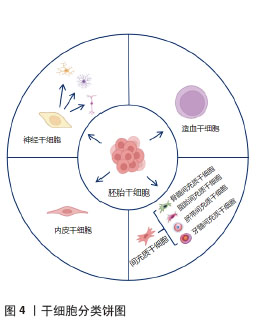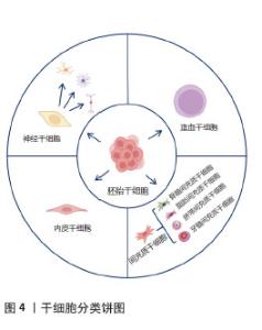 2.1 在中医理论下对干细胞的认识——干细胞属于肾精的范畴 《素问·阴阳应象大论》:“肾生骨髓”。《素问·痿论》“肾主身之骨髓”。肾主骨生髓的生理功能,实际上是肾精即肾气促进机体生长发育的具体体现。肾藏精,精生髓,髓居于骨中成骨髓,居于脑中为脑髓,而脑为髓之海,骨和脑的生长发育,有赖于髓的充盈和滋养。故《素问·六节藏象论》提及肾“其充在骨”。只有肾精充足,髓生化有源,骨骼和脑才能得到髓的滋养。而且《素问·上古天真论》提及“肾者主水,受五脏六腑之精而藏之”。肾主的是一身之精气,对五脏六腑之精具有贮藏、封存之用。肾精分为先天之精和后天之精两个部分(脾胃之精为后天之精),先天之精禀受于父母,是构成生命胚胎的原始物质;后天之精由水谷之精微化生而来,而且“后天之精”依靠于“先天之精”维持,后天不断充养先天,维持生理功能。因此,肾精不仅产生了生命,同时维持着生命的基本活动,肾精从中医理论角度可认为是生命的本源。 干细胞按照发育阶段分类,可以分为胚胎干细胞与成体干细胞。胚胎干细胞的分化能力强,成体干细胞的分化能力弱。从受精卵开始,直到发育至胚盘,胚胎干细胞内存在不同的细胞团,而这些细胞团再进而形成大多数的细胞类型,继续发育成多种细胞的组织或器官[10]。发育完成后,机体存在多种类型的成体干细胞,它们的一生都保持分裂能力和分化能力,在生理过程中和器官损伤后修复中起到关键作用[10]。从生物学的角度出发,干细胞是人类的起源细胞,并通过定向分化为不同类型的下游干细胞,使得生命保持动态平衡。因此,从中医理论出发,结合现代医学研究,干细胞属于肾精的范畴,干细胞的增殖分化与肾精密切相关,它们相辅相成,起协同作用。 2.2 干细胞的分类与特点 干细胞是一种具有自我更新和多向分化潜能的细胞,按照细胞的发育潜能可分为全能干细胞、多能干细胞和单能干细胞;按照发育阶段可分为胚胎干细胞和成体干细胞[11]。胚胎干细胞来自囊胚的内细胞团,具有无限增殖和多向分化潜能,但由于伦理问题,临床应用仍受限[12];成体干细胞指存在于胎儿和出生后个体不同组织中具有自我更新、多向分化潜能和增殖特性的细胞,包括造血干细胞、间充质干细胞、神经干细胞和内皮干细胞等[13]。其中,间充质干细胞和神经干细胞是研究最为广泛的细胞类型,见图4。 "