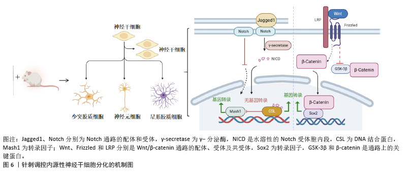 2.3.3 针刺激活信号通路促进干细胞增殖及分化 针刺可以激活多条信号通路协同作用,促进干细胞增殖和分化,修复受损组织。神经干细胞的增殖、分化与Wnt/β-Catenin和Notch信号传导通路有密切关系,见图6。Wnt/β-catenin信号通路是一条进化上高度保守的细胞信号转导途径,通过Wnt 配体与神经元膜上的 Frizzled 受体及共受体LRP结合,可以抑制糖原合成酶激酶3β的活性,从而阻止β-catenin的磷酸化和降解,升高细胞内的β-catenin水平。电针主要通过激活Wnt/β-catenin信号通路,促进β-catenin核内积累,进而促进神经干细胞增殖、分化影响下游靶基因来治疗疾病。电针可以显著上调Wnt1、Nestin、β-catenin的表达,促进神经干细胞的增殖和分化[46],从而促进脊髓损伤的恢复。在创伤性脑损伤模型中,针刺可以上调Sox2、β-catenin的表达,通过激活Wnt/β-catenin信号通路,最终促进神经干细胞的增殖[47]。ZHOU等[48]研究发现,电针可以激活蛛网膜下腔出血大鼠的 Wnt/β-catenin 信号传导,提升Wnt1、β-catenin的表达水平,促进神经干细胞的增殖,进而改善大鼠的认知障碍和海马神经元损伤。Notch信号是一个既经典又高度保守的信号转导通路,由Notch受体、Notch配体、DNA结合蛋白CSL等组成,在维持神经干细胞的自我更新和抑制过早分化中发挥重要作用。相邻细胞的Notch配体与受体特异性结合后,Notch受体蛋白被γ-分泌酶裂解,释放出水溶性的Notch受体胞内段 NICD,与细胞核内的DNA结合蛋白CSL结合形成复合体,影响细胞的基因转录[49]。Hes基因家族是被大家公认的Notch通路的靶基因。针刺可以通过调节Notch途径影响神经干细胞的增殖和分化。ZHAO等[50]研究发现,电针显著增加了海马齿状回中Notch1和Hes1的表达水平,促进海马齿状回的神经干细胞增殖,该研究首次证明了电针可上调Notch信号,促进海马齿状回的神经干细胞增殖和神经发生从而治疗脑卒中。张松江等[51]研究提示电针可以通过激活阿尔茨海默模型小鼠Jagged1/Notch1通路,升高Notch1和Jagged1蛋白表达水平,促进内源性神经干细胞向神经元方向分化,抑制内源性神经干细胞向星形胶质细胞方向分化从而改善小鼠海马神经结构和学习记忆能力。有研究表明,与模型组相比,针刺组可显著提高Notch1、Hes1和Hes5的表达水平,提示针刺可以促进内源性干细胞的增殖促进神经功能修复[52]。还有研究发现电针通过抑制Notch信号通路,显著降低Notch1的表达,增加Mash1的表达,从而促进小鼠海马区神经干细胞的增殖和分化[53]。 2.3.4 针刺调控生长因子的表达促进干细胞增殖和分化 针刺促进机体分泌组织损伤所需要的营养因子,调节机体免疫,减轻炎症反应进而改善微环境,促进内源性干细胞的增殖和分化[8],也可以提高外源性干细胞的存活率,促进外源性干细胞向受损部位迁移[9]。神经营养因子3在防止受损脊髓神经元死亡、维持神经元存活、提高神经元轴突再生能力、促进内源性少突胶质前体细胞分化为成熟少突胶质细胞重建髓鞘结构等发挥重要作用[54-55]。中山大学YAN等[56]围绕神经营养因子3进行了一系列研究发现,电针可以促进损伤脊髓间充质干细胞的分化和神经纤维再生,间充质干细胞联合电针可促进内源性神经营养因子3的表达从而改善后肢的瘫痪功能[57]。在大鼠横断脊髓和大鼠脱髓鞘脊髓中也发现电针可增加神经营养因子3的分泌,促进表达原肌球蛋白受体激酶C的外源性间充质干细胞向少突胶质细胞样分化,改善脱髓鞘脊髓的功能[58-59]。该团队后续研究与3D明胶海绵支架(功能性生物材料)结合有助于高效修复脊髓[60-61]。 其他研究者也对神经营养因子进行了一系列研究,KIM等[62]研究显示电针联合骨髓间充质干细胞可以促进大脑中动脉闭塞小鼠体内神经营养因子4的表达,并且促进了侧脑室视管膜下区和纹状体周围的神经干细胞增殖,从而改善了运动功能。还有研究显示,电针联合表达原肌球蛋白受体激酶B的间充质干细胞移植疗法可以上调大脑中动脉闭塞模型脑源性神经营养因子和神经营养因子4的表达,并诱导cAMP反应结合蛋白的活化,从而促进表达原肌球蛋白受体激酶B的外源性间充质干细胞分化[63]。胶质纤维酸性蛋白是神经胶质细胞的特异性标志物。李江等[64]通过电针联合神经营养因子修饰的神经干细胞移植治疗脊髓损伤,促进外源性神经干细胞增殖、分化和神经功能恢复,可能机制是通过负反馈调节Notch信号通路和抑制胶质纤维酸性蛋白、dll1蛋白表达。张力[65]研究提示,骨髓间充质干细胞移植联合电针可以促进脊髓损伤区的脑源性神经营养因子、表皮生长因子的mRNA表达,从而恢复脊髓损伤大鼠的运动及感觉功能。在脑出血大鼠模型中,电针联合间充质干细胞移植可能通过增强脑源性神经营养因子、表皮生长因子的表达从而促进神经元分化[66]。在神经退行性病变模型中神经营养因子也可以促进干细胞增殖,张松江等[67]研究者在阿尔茨海默模型小鼠中发现,电针改善海马区神经元结构,从而促进内源性干细胞增殖,其机制可能是促进了脑源性神经营养因子的表达。还有研究者发现,针刺可以改善小鼠的认知功能,可能是提高了快速老化型小鼠海马区的碱性成纤维细胞生长因子、表皮生长因子、脑源性神经营养因子的表达,改善微环境,进而促进神经干细胞的存活、增殖而介导的[68]。 神经细胞黏附分子L1对神经元存活和轴突生长起到促进作用[69],有研究表明,对脊