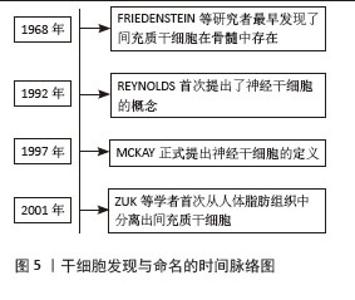 2.2.1 间充质干细胞 在1968年,由FRIEDENSTEIN等[14]研究者最早通过贴壁分离得到一种“纺锤形”且具有造血功能的干细胞。间充质干细胞广泛存在于骨髓、脐血、脂肪等多种人体组织中[15]。间充质干细胞包括骨髓间充质干细胞、脂肪间充质干细胞、脐血间充质干细胞、牙髓间充质干细胞等,其中最为常见的是骨髓间充质干细胞和脂肪间充质干细胞。骨髓间充质干细胞是一种多能细胞,通过自我更新、分化和免疫调节等特性被广泛应用于多种疾病的治疗,体内和体外研究提供了骨髓间充质干细胞临床应用的机制、安全性、有效性的证据[16]。但是骨髓间充质干细胞的分化潜能、数量、寿命等特性受到捐献者年龄的限制[17]。2001年,ZUK等[18]学者首次从人体脂肪组织中分离出间充质干细胞,该细胞具有稳定的群体倍增和低水平衰老的特性,且经诱导可分化为成脂、成软骨、成肌、成骨细胞。与其他组织相比,脂肪组织覆盖的生物体面积更大,来源广泛、采集更为方便,对患者的创伤较小[19]。脂肪间充质干细胞在临床前和临床中已经被证实具有多向分化潜能以及自我更新和增殖能力,尤其是骨、软骨、心肌、肝脏、神经系统再生以及皮肤伤口愈合方面[20]。 2.2.2 神经干细胞 神经干细胞是一类存在于神经系统中具有自我更新能力和多向分化潜能的细胞[21]。1992年,REYNOLDS等[22]发现小鼠纹状体细胞具有分裂和分化为神经元和星形胶质细胞的能力,首次提出了神经干细胞的概念。在1997年,MCKAY[23]对神经干细胞正式提出定义:具有分化为神经元、星形胶质细胞、少突胶质细胞的潜能,并且能够充分自我更新以提供脑内的细胞数量。内源性神经干细胞主要位于海马齿状回颗粒下层区和侧脑室的视管膜下区,内源性神经干细胞可在“壁龛”内长期保持休眠状态,在受到损伤刺激时激活,增殖分化为相应类型的细胞修复损伤组织和替换损伤细胞[24]。外源性神经干细胞通过直接替代或旁分泌作用促进内源性神经干细胞修复或替代损伤的神经细胞[25]。内源性神经干细胞还可调节神经营养因子和递质的产生,防止细胞凋亡,抑制神经炎症,影响神经元-胶质细胞的交互机制,从而增强认知、学习功能,尤其是神经退行性疾病,如阿尔茨海默病、亨廷顿病、帕金森病等[26]。外源性神经干细胞通过直接替代或旁分泌效应等多种机制促进神经再生和修复[25]。神经生长因子、脑源性神经营养因子、神经营养因子3分别与原肌球蛋白受体激酶A、原肌球蛋白受体激酶B、原肌球蛋白受体激酶C结合从而调节多种生物学反应,包括细胞增殖和存活、轴突和树突的生长和重塑、突触功能的改变[27]。神经干细胞的增殖分化还与Wnt/β-Catenin、Notch、Sonic Hedgehog(Shh)等信号传导通路有密切关系[28]。 干细胞发现与命名的时间脉络图见图5。 基于中医理论发现,干细胞属于肾精范畴。因此,人们对于干细胞治疗肾精不足证型疾病尤其是神经系统疾病报有很高的期望,与填补肾精起协同作用[29]。 "