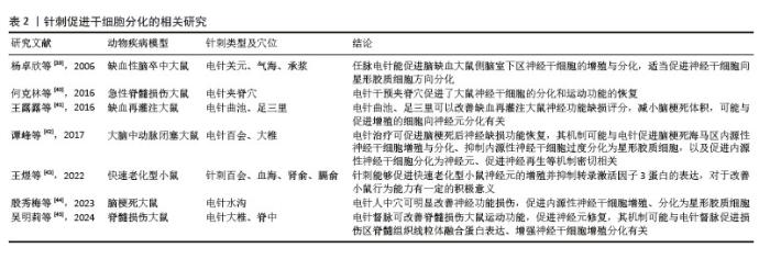 2.3.2 针刺对干细胞分化的影响 针刺不仅对干细胞增殖起到促进作用,还可调节神经干细胞分化为神经元、星形胶质细胞。杨卓欣等[39]发现,电针任脉穴位可促进侧脑室视管膜下区的神经干细胞分化从而发挥治疗作用。何克林等[40]提出电针刺激夹脊穴通过促进大鼠神经干细胞的分化,从而改善急性脊髓损伤大鼠的运动功能。王露露等[41]对缺血再灌注大鼠的“曲池”“足三里”进行电针治疗14 d,发现病灶区域缩小,可能是电针促进侧脑室视管膜下区的神经干细胞分化成为成熟神经元发挥神经保护作用。电针干预“百会”“大椎”穴可促进海马区内源性神经干细胞的增殖与分化,增强神经再生[42]。王煜等[43]发现针刺“百会”“血海”“肾俞”“膈俞”穴通过抑制转录激活因子3蛋白的表达促进快速老化型小鼠神经干细胞增殖分化为神经元。殷秀梅等[44]研究者经多个时间点观察发现,电针干预脑梗死大鼠“人中”穴后,可促进内源性神经干细胞的增殖并分化为星形胶质细胞。在脊髓损伤模型中,电针通过提升线粒体融合蛋白的表达从而促进神经干细胞的增殖分化,发挥神经修复功能[45]。 以上结果表明针刺通过促进神经干细胞向星形胶质细胞、神经元分化,抑制内源性神经干细胞过度分化为星形胶质细胞,以及促进内源性神经干细胞分化为神经元和促进损伤区脊髓组织线粒体融合蛋白表达等来改善模型大鼠的运动功能。文章总结了针刺促进干细胞分化的研究现状,见表2。 "