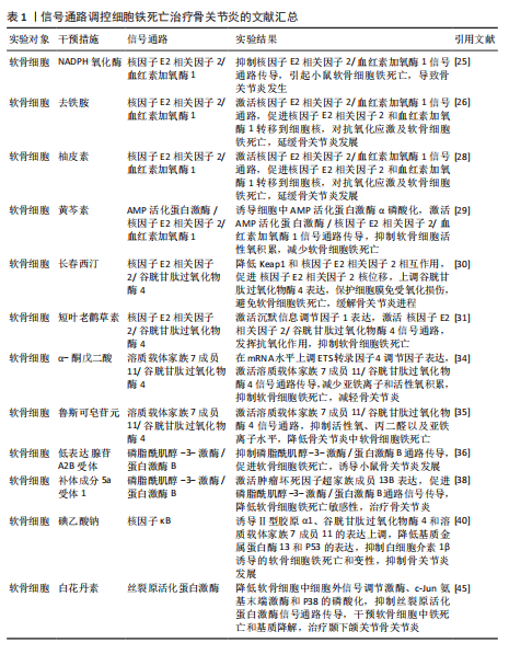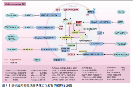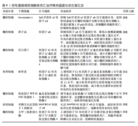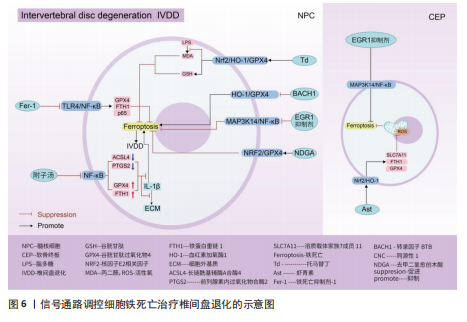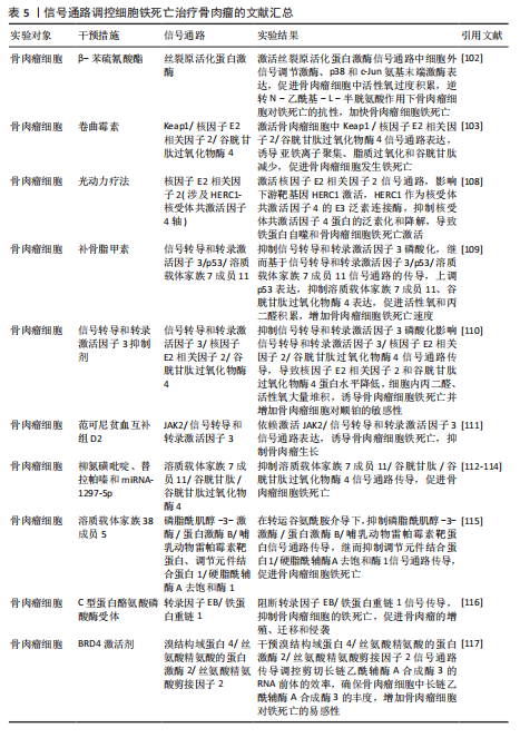 死亡抑制剂Ferrostatin-1通过抑制Toll样受体4/核因子κB信号通路的传导,可以逆转椎间盘退化对髓核细胞中谷胱甘肽过氧化物酶4、铁蛋白重链1和p65的表达,达到抑制髓核细胞铁死亡的目的,控制椎间盘退化的发展。早期生长应答因子1抑制剂通过灭活MAP3K14/核因子κB信号通路,从而减轻软骨细胞铁死亡,同时缓解软骨终板钙化变性[90]。 核因子E2相关因子2信号通路:LI等[91]发现托马替丁不仅通过促进细胞外基质合成代谢,抑制细胞外基质分解代谢的作用影响椎间盘退化的发生;托马替丁还可以通过促进核因子E2相关因子2/血红素加氧酶1/谷胱甘肽过氧化物酶4信号通路的表达,减少在脂多糖作用下髓核细胞中丙二醛的水平,增加谷胱甘肽的水平,抑制髓核细胞氧化应激反应,减少髓核细胞铁死亡。核因子E2相关因子2/血红素加氧酶1/谷胱甘肽过氧化物酶4信号通路不仅可以调控髓核细胞铁死亡,还具备调控软骨终板钙化软骨细胞铁死亡的能力。虾青素便是依赖上调核因子E2相关因子2/血红素加氧酶1信号通路表达,恢复因叔丁基过氧化氢(具备模拟椎间盘退化环境的能力)而被抑制的谷胱甘肽过氧化物酶4、铁蛋白重链1和溶质载体家族7成员11水平,减少软骨终板钙化软骨细胞中活性氧积累,恢复线粒体功能,减少氧化应激反应带来的软骨终板钙化软骨细胞铁死亡[92]。去甲二氢愈创木酸通过上调核因子E2相关因子2/谷胱甘肽过氧化物酶4信号通路表达,可降低髓核细胞铁死亡、细胞外基质降解以及炎症反应,达到缓解椎间盘退化的目的[93]。 血红素加氧酶1/谷胱甘肽过氧化物酶4信号通路:转录因子BTB和CNC同源性1通过抑制血红素加氧酶1/谷胱甘肽过氧化物酶4信号通路的传导,可促进髓核细胞氧化应激反应导致髓核细胞铁死亡,加快椎间盘退化的发展[94]。在这里转录因子BTB和CNC同源性1直接靶向血红素加氧酶1/谷胱甘肽过氧化物酶4信号通路,而不是通过核因子E2相关因子2信号通路影响血红素加氧酶1表达,说明药物直接靶向下游信号通路同样可以调控铁死亡的发生。 椎间盘退化并不是常规意义的骨科疾病,但它是脊柱退行性疾病发生的源头,因此了解椎间盘退化的全过程对治疗脊柱退行性疾病具有深远的意义。基于上述通过药物调控信号通路干预相关细胞铁死亡的发生治疗椎间盘退化,有望通过药物治疗的手段去缓解或逆转椎间盘退化的发生。但是,药物治疗需要通过血管传输,但鉴于椎间盘特殊的微环境,而其自身无血管结构可能会影响治疗药物的有效传输,在下一步研究中希望得到解决。见图6及表4。 2.5 骨肉瘤 骨肉瘤是一种由间充质干细胞所引发的原发性恶性肿瘤,好发部位为长骨两端的生长板处,在颅骨、下颌骨和骨盆等扁骨中较少出现,多见于15-19岁的青少年人群[95-96]。目前,对于该病常用的治疗方法包括手术治疗、基因治疗、免疫治疗、化疗和分子靶向治疗。新辅助化疗方案的出现使患者的5年生存率提升至70%,但对转移或复发患者,5年生存率仍然只有20%-30%,并且伴随着严重的不良反应及全身系统性的毒性反应[97-99]。近年来研究表明铁死亡与肿瘤的病理发展过程密切相关,针对肿瘤细胞铁死亡的靶向诱导成为治疗肿瘤疾病的新的方向,其中包含骨肉瘤[100-101]。 丝裂原活化蛋白激酶信号通路:经典的肿瘤化学药物β-苯硫氰酸酯通过对丝裂原活化蛋白激酶信号通路中细胞外信号调节激酶、p38和c-Jun氨基末端激酶表达激活,促进骨肉瘤细胞中活性氧过度积累,逆转N-乙酰基-L-半胱氨酸作用下骨肉瘤细胞对铁死亡产生的抗性作用,加快骨肉瘤细胞铁死亡[102]。"