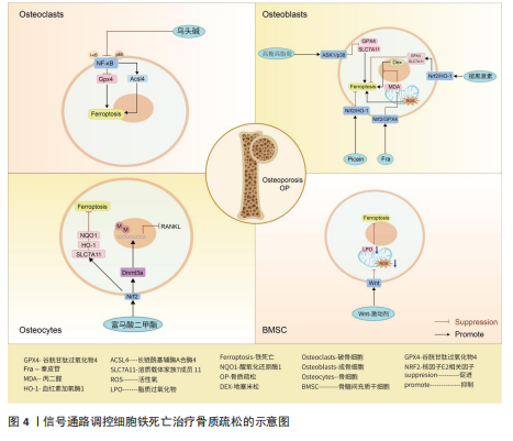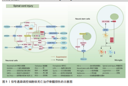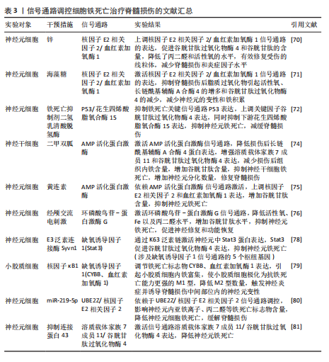 号通路的激活并不能逆转铁过载这一现象,当然,这并不妨碍其具备降低骨髓间充质干细胞铁死亡的能力[59]。由此可以得出,Wnt信号通路虽然在铁过载情况下不具备减少亚铁离子堆积的能力,但是可以是通过减少骨髓间充质干细胞氧化应激损伤而提高铁死亡的阈值,避免铁死亡的发生。 核因子E2相关因子2信号通路作为调控铁死亡发生的重要途径之一,在骨质疏松疾病中不仅可以干预成骨细胞的铁死亡,还可以通过干预核因子κB受体活化因子配体表达,影响骨细胞的破骨分化。众所周知,核因子κB受体活化因子配体是核因子κB的激活剂,两者相互结合诱导破骨细胞生成。由此可以得出推论核因子E2相关因子2信号通路干预骨细胞铁死亡以及破骨分化过程中,可能伴随着核因子κB信号通路的身影。见图4及表2。 2.3 脊髓损伤 脊髓损伤是由交通意外等机械力引起脊柱骨折或脱位造成原发性损伤,随后引起局部出血、缺血、缺氧、离子失衡、自由基应激等继发性损伤,造成严重的中枢神经损伤,临床表现为截瘫、感觉丧失和其他脊髓异常[60-61]。脊髓损伤之所以具有高致残以及致死率,与其损伤后神经无法再生有着密切联系[62-63]。目前研究成果表明,在脊髓损伤继发性损伤时期,活性氧的过度积累引起的氧化应激反应可能是阻碍神经再生的关键因素[5,60,62]。 这与神经元磷脂膜中丰富的多不饱和脂肪酸残基和清除活性氧的能力差有关,使得神经元本质上容易受到氧化应激的影响有关[64-66]。而活性氧的过度积累引起的氧化应激反应是引起铁死亡的重要途径,因此,干预神经元铁死亡的治疗思路可能是提高神经元存活率的理想方法[67-69]。 核因子E2相关因子2信号通路:GE等[70]通过脊髓损伤小鼠模型发现,锌通过上调核因子E2相关因子2/血红素加氧酶1信号通路的表达,增加谷胱甘肽过氧化物酶4和谷胱甘肽的含量,降低了丙二醛和活性氧的水平,有效修复受伤的线粒体,减少脊髓损伤和炎症因子水平。GONG等[71]同样运用核因子E2相关因子2/血红素加氧酶1信号通路强效抗氧化能力,运用海藻糖激活核因子E2相关因子2/血红素加氧酶1信号通路的表达,抑制脊髓损伤后脂质过氧化物引起活性氧、长链酰基辅酶A合酶4的增多和谷胱甘肽过氧化物酶4的减少,减少神经元的变性和铁积累,从而促进神经元的存活并改善运动功能的恢复。 P53/花生四烯酸脂氧合酶15信号通路:铁死亡抑制剂二氢乳清酸脱氢酶可以通过抑制P53/花生四烯酸脂氧合酶15信号通路的传导,抑制神经元铁死亡的发生,减缓脊髓损伤[72]。该实验一方面证实,二氢乳清酸脱氢酶是通过抑制铁死亡关键信号通路P53的表达,进而上调关键因子谷胱甘肽过氧化物酶4表达,干预神经元铁死亡;另一方面,二氢乳清酸脱氢酶与P53均可以通过抑制下游花生四烯酸脂氧合酶15的表达,达到抑制神经元铁死亡的目的。P53与花生四烯酸脂氧合酶15之间的相互作"