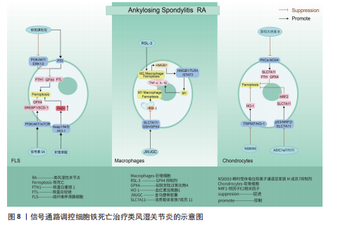 Keap1/核因子E2相关因子2 /谷胱甘肽过氧化物酶4信号通路:随着纳米颗粒的发展,通过携带传统抗结核药物卷曲霉素的骨靶向外泌体具备直接靶向骨肉瘤细胞的能力,其通过激活骨肉瘤细胞中Keap1/核因子E2相关因子2/谷胱甘肽过氧化物酶4信号通路表达,诱导亚铁离子聚集、脂质过氧化和谷胱甘肽减少,促进骨肉瘤细胞发生铁死亡,在对机体无明显不良反应的情况下提高患者的生存率[103]。 核因子E2相关因子2信号通路:光动力疗法作为一种无创、低毒性的新型治疗方法,已被证实是治疗骨肉瘤的有效方法[104-107]。研究表明,MPPα-光动力疗法通过激活核因子E2相关因子2信号通路,进而影响下游靶基因HERC1激活,HERC1作为核受体共激活因子 4的E3泛素连接酶,靶向HERC1,成功抑制了核受体共激活因子4蛋白的泛素化和降解,导致铁蛋白自噬和骨肉瘤细胞铁死亡的激活[108]。 信号转导和转录激活因子3信号通路:研究表明,类黄酮补骨脂甲素可以抑制信号转导和转录激活因子3磷酸化,继而基于信号转导和转录激活因子3/p53/溶质载体家族7成员11信号通路的传导,上调p53表达,抑制溶质载体家族7成员 11、谷胱甘肽过氧化物酶4表达,促进活性氧和丙二醛积累,加快骨肉瘤细胞铁死亡速度[109]。不仅如此,抑制信号转导和转录激活因子3磷酸化还可影响信号转导和转录激活因子3/核因子E2相关因子2/谷胱甘肽过氧化物酶4信号通路的传导,导致核因子E2相关因子2和谷胱甘肽过氧化物酶4蛋白水平降低,导致细胞内丙二醛、活性氧大量堆积,诱导骨肉瘤细胞铁死亡并增加骨肉瘤细胞对顺铂的敏感性[110]。另外,沉默的范可尼贫血互补组 D2通过依赖激活 JAK2/信号转导和转录激活因子3 信号通路表达诱导骨肉瘤细胞铁死亡,抑制骨肉瘤的生长[111]。 溶质载体家族7成员 11/谷胱甘肽/谷胱甘肽过氧化物酶4 信号通路:柳氮磺吡啶、替拉帕嗪和 miRNA-1297-5p可通过抑制 溶质载体家族7成员 11/谷胱甘肽/谷胱甘肽过氧化物酶4 信号通路传导促进骨肉瘤细胞铁死 亡[112-114]。 磷脂酰肌醇-3-激酶/蛋白激酶B/哺乳动物雷帕霉素靶蛋白信号通路:沉默的溶质载体家族38成员5在转运谷氨酰胺介导下抑制磷脂酰肌醇-3-激酶/蛋白激酶B/哺乳动物雷帕霉素靶蛋白信号通路传导,继而抑制调节元件结合蛋白1/硬脂酰辅酶A去饱和酶1信号通路的传导,从而促进骨肉瘤细胞的铁死亡[115]。 转录因子EB/铁蛋白重链 1 信号通路:C型蛋白酪氨酸磷酸酶受体通过阻断转录因子EB/铁蛋白重链1信号传导抑制骨肉瘤细胞的铁死亡,促进骨肉瘤的增殖、迁移和侵袭[116]。 溴结构域蛋白4/丝氨酸精氨酸的蛋白激酶2/丝氨酸精氨酸剪接因子2信号通路:溴结构域蛋白4/丝氨酸精氨酸的蛋白激酶2/丝氨酸精氨酸剪接因子2信号通路通过调控剪切长链乙酰辅酶A合成酶3的RNA前体的效率,确保骨肉瘤细胞中长链乙酰辅酶A合成酶3的丰度,而长链乙酰辅酶A合成酶3的AMP结合结构域是花生四烯酸合成代谢所必需的,该物质的合成有助于增加骨肉瘤细胞对铁死亡的易感性,因此溴结构域蛋白 4/丝氨酸精氨酸的蛋白激酶2/丝氨酸精氨酸剪接因子2信号通路可能是治疗骨肉瘤的潜在靶标[117]。 癌细胞通常具有较高的活性氧水平以维持其恶性增殖,而较高的内源性活性氧水平同样使它们更容易受到氧化应激伤害。因此氧化还原系统的改变和抗氧化系统的功能障碍可能有助于改善耐药性和抗癌治疗的重要途径。而通过上述综述可知,多种药物通过靶向信号通路可以加快骨肉瘤细胞中活性氧的堆积,诱发骨肉瘤细胞的铁死亡,明确了信号通路、铁死亡与骨肉瘤细胞三者之间的密切联系,为骨肉瘤的治疗提供新的方向。但是活性氧的堆积引起的氧化应激反应不仅触发癌细胞的铁死亡,其还引起癌细胞的自噬以及细胞凋亡等程序性死亡的发生。关于骨肉瘤细胞中不同程序性死亡之间是否发生串扰以及同一条信号通路是否可以控制多种程序性死亡的发生,需要进一步通过实验明确。见图7及表5。 2.6 类风湿关节炎 类风湿关节炎是一种由多因素引起的自身免疫性疾病,其特征主要包含滑膜炎症、关节软骨破坏以及骨侵蚀,在临床"