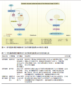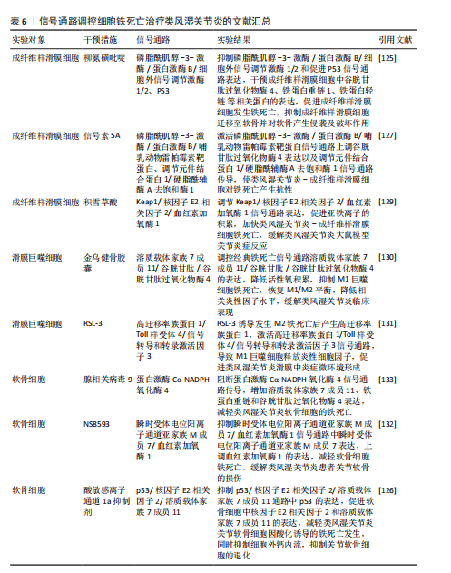 上表现为关节疼痛、肿胀、畸形,甚至残疾[118]。滑膜炎症反应主要是指滑膜内膜层发生的炎症发应,与成纤维样滑膜细胞、滑膜巨噬细胞通过分泌软骨基质酶和细胞因子,促进免疫细胞的浸润有关[119-120]。关节软骨作为关节的重要结构,软骨的退化与损伤是引起类风湿关节炎患者功能障碍的另一重要原因[121-122]。而软骨细胞作为唯一构成软骨的细胞类型,其通过调节软骨基质蛋白(如Ⅱ型胶原蛋白和蛋白多糖)的产生、更新和降解[123],从而维持软骨完整性[124]。因此,通过信号通路的调节干预成纤维样滑膜细胞、滑膜巨噬细胞以及软骨细胞铁死亡的发生,可能会成为类风湿关节炎治疗的新策略。 磷脂酰肌醇-3-激酶/蛋白激酶B、P53信号通路:ZHAO等[125]通过柳氮磺吡啶治疗类风湿关节炎大鼠发现,柳氮磺吡啶主要通过抑制磷脂酰肌醇-3-激酶/蛋白激酶B/细胞外信号调节激酶1/2和促进P53信号通路表达,达到干预成纤维样滑膜细胞中谷胱甘肽过氧化物酶4、铁蛋白重链1、铁蛋白轻链等相关蛋白的表达,促进成纤维样滑膜细胞发生铁死亡,抑制成纤维样滑膜细胞迁移至软骨并对软骨产生侵袭及破坏作用。但在基于柳氮磺吡啶处理下添加磷脂酰肌醇-3-激酶/蛋白激酶B/细胞外信号调节激酶1/2信号通路激活剂以及P53信号通路抑制剂时发现,P53抑制剂的添加会使得成纤维样滑膜细胞活力恢复更佳,侧面说明P53通路在干预成纤维样滑膜细胞铁死亡治疗类风湿关节炎过程中起着更关键的作用。抑制酸敏感离子通道1a 的表达可以抑制p53/核因子E2相关因子2/溶质载体家族7成员11通路中p53的表达,促进软骨细胞中核因子E2相关因子2和溶质载体家族7成员11的表达,减轻类风湿关节炎关节软骨细胞因酸化诱导的铁死亡发生,并抑制因细胞外酸化而发生的细胞外钙内流,抑制关节软骨细胞的退化[126]。信号素5A依赖激活磷脂酰肌醇-3-激酶/蛋白激酶B/哺乳动物雷帕霉素靶蛋白信号通路上调谷胱甘肽过氧化物酶4表达以及调节元件结合蛋白1/硬脂酰辅酶A去饱和酶1信号通路的传导,使得类风湿关节炎-成纤维样滑膜细胞对铁死亡产生抗性[127]。其中磷脂酰肌醇-3-激酶/蛋白激酶B/哺乳动物雷帕霉素靶蛋白信号通路上调谷胱甘肽过氧化物酶4表达,可能与抑制下游分子4E-BP1有关[128]。 Keap1/核因子E2相关因子2/血红素加氧酶1信号通路:SUN等[129]通过积雪草酸治疗类风湿关节炎发现,积雪草酸通过调节Keap1/核因子E2相关因子2/血红素加氧酶1信号通路表达促进亚铁离子的积累,加快类风湿关节炎-成纤维样滑膜细胞铁死亡,有效缓解类风湿关节炎大鼠模型关节炎症反应。 溶质载体家族7成员11/谷胱甘肽/谷胱甘肽过氧化物酶4信号通路:金乌健骨胶囊依赖于调控经典铁死亡信号通路溶质载体家族7成员 11/谷胱甘肽/谷胱甘肽过氧化物酶4的表达,降低活性氧积累,抑制M1巨噬细胞铁死亡,降低肿瘤坏死因子α、白细胞介素1β等相关炎性因子水平,缓解类风湿关节炎的临床表现[130]。但是,FENG等[131]发现,在铁含量高的类风湿关节炎滑膜环境中,M2发生铁死亡的概率高于M1,M2发生铁死亡后会产生高迁移率族蛋白1(内源性危险信号),继而引起高迁移率族蛋白1/Toll样受体4/信号转导和转录激活因子3信号通路的激活,诱导M1巨噬细胞释放肿瘤坏死因子α、白细胞介素1β等炎性细胞因子,促进了类风湿关节炎滑膜中炎症微环境的形成。众所周知,M1/M2平衡是维持关节内炎性状态的关键。通过文献可知M2铁死亡状态下通过信号通路促进M1炎性因子的释放。但是金乌健骨胶囊在抑制M1铁死亡的状态下,却得出抑制相关炎性因子水平的结论,这两种文献给出相悖的结论,可能需要进一步实验。 瞬时受体电位阳离子通道亚家族 M成员7/血红素加氧酶1、PKCα-NADPH氧化酶4信号通路:HAO等[132]通过NS8593对瞬时受体电位阳离子通道亚家族M成员7/血红素加氧酶1信号通路中瞬时受体电位阳离子通道亚家族M成员7表达的抑制,上调血红素加氧酶1的表达,有效减轻软骨细胞铁死亡,缓解类风湿关节炎患者关节软骨的损伤。腺相关病毒9抑制瞬时受体电位阳离子通道亚家族M成员7的表达可以阻断PKCα-NADPH氧化酶4信号通路的传导,增加溶质载体家族7成员11、铁蛋白重链和谷胱甘肽过氧化物酶4表达,减轻类风湿关节炎软骨细胞的铁死亡[133]。 通过上述文献总结可知,信号通路的调控对软骨细胞、成纤维样滑膜细胞以及巨噬细胞的铁死亡具有重要的意义。而类风湿关节炎作为一种慢性自身免疫性炎症疾病,其发生发展与免疫T细胞息息相关,但是,目前尚未有关于信号通路调控T细胞铁死亡治疗类风湿关节炎的相关报道,未来可以加大相关研究的探索。见图8及表6。 2.7 激素性股骨头坏死 激素性股骨头坏死是指类固醇的滥用引起骨细胞缺血、坏死、骨小梁断裂,临床表现为髋部疼痛、股骨头塌陷和关节功能障碍等,严重者可导致残疾[134]。由于多数患者缺少对激素性股骨头坏死的认知,加之坏死组织修复困难、致残率高,如果不进行早期临床干预,大多数股骨头坏死周围塌陷的患者最终需要进行髋关节置换手术[135]。手术治疗是最后手段,通过药物缓解或逆转激素性股骨头坏死的发展也许是未来治疗该病的更佳方案。目前已知铁死亡可以通过调控相关骨细胞死亡的进程,可能是治疗激素性股骨头坏死的新方向。 P53/溶质载体家族7成员 11/谷胱甘肽过氧化物酶4信号通路:SUN等[136]