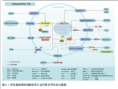 2.1 骨关节炎 骨关节炎是一种慢性退行性关节病,该病具有较强的致残性,疾病致使关节软骨以及软骨下骨的缺损、滑膜组织的增生肥大、周围血管异常增生,以及关节周围韧带肌腱的不稳[20]。骨关节炎是一种具有高发病率与致残性的骨科疾病,目前仍没有彻底治愈该病的有效方案,究其原因,主要是其发病机制具有复杂多样性,涉及组织相互作用、关节软骨的细胞生物学变化等[21-22]。目前研究表明,软骨细胞铁死亡是骨关节炎发生的病理特征。而信号通路的调节是引起软骨细胞铁死亡发生的重要因素。 核因子E2相关因子2信号通路:核因子E2相关因子2作为一种抗氧化转录因子中的关键因子,可通过诱导血红素加氧酶1激活达到抑制氧化应激反应以及铁死亡的目的[23-24]。动物实验报道,NADPH氧化酶1是一种细胞内氧化反应的激活剂,当NADPH氧化酶1水平过高时会抑制核因子E2相关因子2/血红素加氧酶1信号通路的传导,致使氧化还原平衡被打破,继而引起小鼠软骨细胞的铁死亡,导致骨关节炎疾病的发生[25]。GUO等[26]通过对小鼠的关节腔内注射去铁胺(一种铁螯合剂,可用于治疗铁超负荷类疾病)发现,去铁胺通过激活核因子E2相关因子2/血红素加氧酶1信号通路[27],促进核因子E2相关因子2和血红素加氧酶1转移到细胞核中,以对抗氧化应激反应以及软骨细胞的铁死亡,延缓骨关节炎的发展。PAN等[28]通过从中药骨碎补中提取的柚皮素同样通过上调核因子E2相关因子2/血红素加氧酶1信号通路表达,减少软骨细胞中活性氧和脂质过氧化物的积累,减少氧化应激,减轻铁过载下的软骨损伤,达到治疗骨关节炎的目的。针对骨关节炎小鼠的实验发现,黄芩素通过诱导细胞中AMP活化蛋白激酶α磷酸化,激活AMP活化蛋白激酶/核因子E2相关因子2/血红素加氧酶1信号通路的传导,抑制软骨细胞内活性氧积累,减少软骨细胞的铁死亡[29]。长春西汀通过降低Keap1和核因子E2相关因子2的相互作用,减缓核因子E2相关因子2的降解以及促进核因子E2相关因子2的核位移,使得谷胱甘肽过氧化物酶4表达上调,将有害的磷脂过氧化物转化为无害的磷脂醇来保护细胞膜免受氧化损伤,避免软骨细胞发生铁死亡,缓解骨关节炎的进程[30]。在小鼠骨关节炎模型中,短叶老鹳草素通过激活沉默信息调节因子1表达,使得核因子E2相关因子2/谷胱甘肽过氧化物酶4信号通路激活,发挥抗氧化作用,抑制软骨细胞铁死亡,使得小鼠免受骨关节炎的侵害[31]。 溶质载体家族7成员11/谷胱甘肽过氧化物酶4信号通路:系统Xc-中溶质载体家族7成员11通过调控谷胱甘肽过氧化物酶4表达干预细胞铁死亡[32-33]。α-酮戊二酸因具有强大抗氧化、抗炎特性而闻名。目前有证据证实,α-酮戊二酸在mRNA水平上调ETS转录因子4调节因子表达,进而激活溶质载体家族7成员11/谷胱甘肽过氧化物酶4信号通路传导,减少亚铁离子和活性氧积累,抑制软骨细胞铁死亡,减轻骨关节炎[34]。鲁斯可皂苷元治疗骨关节炎疾病,同样是通过激活溶质载体家族7成员11/谷胱甘肽过氧化物酶4信号通络,抑制活性氧、丙二醛以及亚铁离子水平,达到降低骨关节炎中软骨细胞铁死亡的目的[35]。 磷脂酰肌醇-3-激酶/蛋白激酶B信号通路:磷脂酰肌醇-3-激酶/蛋白激酶B是丝氨酸/苏氨酸蛋白激酶家族成员之一,该信号通路具备促进代谢、增殖、生长和血管生成等多种功能。LI等[36]通过对引起软骨细胞铁死亡的基因筛选发现,低表达的腺苷A2B受体通过抑制磷脂酰肌醇-3-激酶/蛋白激酶B通路传导促进软骨细胞铁死亡,诱导小鼠骨关节炎的发展。另外,补体成分5a受体1被证实为骨关节炎发生发展过程中的关键基因[37]。通过骨关节炎大鼠的实验发现,补体成分5a受体1通过激活肿瘤坏死因子超家族成员13B表达,促进磷脂酰肌醇-3-激酶/蛋白激酶B通路信号传导,进而降低软骨细胞铁死亡的敏感性,达到治疗骨关节炎疾病的目的[38]。 核因子κB信号通路:核因子κB信号通路通过对骨关节炎中软骨代谢的影响促进或者抑制骨关节炎的发生发展[39]。当核因子κB信号通路传导被抑制时,诱导Ⅱ型胶原α1、谷胱甘肽过氧化物酶4和溶质载体家族7成员11的表达上调,同时降低基质金属蛋白酶13和P53的表达,从而抑制白细胞介素1β诱导的软骨细胞铁死亡和变性,抑制骨关节炎的发展[40]。不仅如此,骨关节炎早期软骨下骨的病理改变与破骨细胞异常激活密切相关,而核因子κB信号通路是激活破骨细胞形成的重要通路之一[41]。那是否可以得出碘乙酸钠通过核因子κB信号通路控制骨关节炎疾病中两种细胞的存活,这为未来骨关节炎的治疗提供了新的思路。 丝裂原活化蛋白激酶信号通路:丝裂原活化蛋白激酶信号通路由细胞外信号调节激酶、c-Jun氨基末端激酶和p38共同组成,当它们接受信号刺激时,会将信号从细胞膜传递至细胞核,以达到调控细胞的增殖分化、炎症以先天免疫等[42]。有关研究报道,人骨关节炎软骨中磷酸化的细胞外信号调节激酶、c-Jun氨基末端激酶以及p38丰富程度均高于正常软骨中的水平[43-44]。CUI等[45]通过白花丹素治疗大鼠颞下颌关节骨关节炎发现,白花丹素主要通过降低软骨细胞中 细胞外信号调节激酶、c-Jun氨基末端激酶和P38的磷酸化,抑制丝裂原活化蛋白激酶信号通路的传导,进而干预软骨细胞中铁死亡和基质降解,达到治疗颞下颌关节骨关节炎的目的。因此骨关节炎的发展可能与丝裂原活化蛋白激酶通路