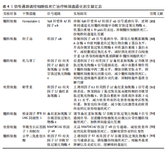 用,可能是通过亚精胺/精胺N1-乙酰转移酶1作为中间介质来完成[73]。 AMP活化蛋白激酶信号通路:二甲双胍被证实可以促进脊髓损伤后的内源性神经干细胞增殖、神经元分化以及抑制铁死亡的发生,其原理主要是依赖激活AMP活化蛋白激酶信号通路,使得损伤后长链酰基辅酶A合酶4蛋白表达降低,溶质载体家族7成员11和谷胱甘肽过氧化物酶4的表达增强,有效减少损伤后组织内的铁含量,增加谷胱甘肽含量,有效改善了神经干细胞的铁死亡,并增加神经元分化数量,达到修复脊髓损伤的目的[74]。另外,黄连素同样是依赖于AMP活化蛋白激酶信号通路的激活,进而上调核因子E2相关因子2和血红素加氧酶1的表达,增加谷胱甘肽的含量,抑制脊髓损伤中神经元铁死亡[75]。 环磷酸鸟苷-蛋白激酶G信号通路:经颅交流电刺激是一种治疗脊髓损伤有效的康复手段,研究表明,其依靠激活环磷酸鸟苷-蛋白激酶G信号通路,从而降低活性氧、亚铁离子以及丙二醛的水平,增加谷胱甘肽水平,抑制神经元铁死亡,促进脊髓损伤患者神经修复和功能恢复[76]。 缺氧诱导因子1信号通路:通过GEO数据库分析发现,缺氧诱导因子1信号通路在脊髓损伤中发挥重要作用,这与缺氧诱导因子1 信号通路的5个枢纽基因(Stat3、Tlr4、血红素加氧酶1、Hif1a和CYBB)有着密切联系[77]。其中,E3泛素连接酶 Syvn1正是通过K63 泛素链激活神经元中Stat3蛋白表达,继而Stat3 促进谷胱甘肽过氧化物酶4表达,抑制神经元铁死亡的发生[78]。另外,转录因子核因子κB1通过调节铁死亡标志物CYBB、血红素加氧酶1表达,引起脊髓损伤中小胶质细胞内铁富集,使得小胶质细胞更易极化为抗铁死亡能力更强的M1型,造成对铁死亡更敏感的M2型数量的降低,触发神经炎症并诱导脊髓损伤中间部位内的神经元变性[79]。通过缺氧诱导因子1 信号通路上的枢纽基因Stat3、血红素加氧酶1可知,在调控铁死亡过程中信号通路存在相互干预的影响,并非完全平行的关系。 UBE2Z/核因子E2相关因子2信号通路:骨髓间充质干细胞来源的外泌体 miR-219-5p依赖于UBE2Z/核因子E2相关因子2信号通路的调控,影响神经元内亚铁离子、丙二醛等铁死亡标志物含量,降低神经元细胞铁死亡,达到缓解脊髓损伤的作用[80]。 溶质载体家族7成员 11/谷胱甘肽过氧化物酶4信号通路:抑制连接蛋白43治疗脊髓损伤,其原理是依赖激活信号通路溶质载体家族7成员 11/谷胱甘肽过氧化物酶4表达,降低神经元铁死亡实现的[81]。 神经炎症反应是创伤后脊髓损伤的重要反应。最早参与炎症反应的细胞是小胶质细胞和中性粒细胞。铁死亡的过程通常伴有炎症反应。目前研究表明,海藻糖或者锌处理后,在保护神经元避免铁死亡的同时,脑脊液和脊髓组织中白细胞介素1β、白细胞介素6和肿瘤坏死因子α 的水平降低,但其具体的作用机制以及是否与铁死亡有关并不清晰,可能与小胶质细胞铁离子富集诱导M1型分化增多有关,具体还需要进一步实验证实。见图5及表3。 2.4 椎间盘退化 椎间盘退化是连接2个相邻椎骨的椎间盘疾病,是引起临床常见疾病腰部、背部、颈部疼痛发生的主要原因之一[82-83]。从解剖角度出发,椎间盘位于2个椎体之间,由髓核、纤维环和软骨终板组成。从病理生理角度出发,髓核细胞死亡、纤维环裂、软骨终板和细胞外基质代谢失衡均是引起椎间盘退化的重要机制[84]。目前研究表明,铁死亡可通过干预髓核细胞死亡、软骨终板细胞死亡和细胞外基质降解等形式,影响椎间盘退化的进程[85-87]。 核因子κB信号通路:中药附子汤治疗椎间盘退化是依赖于抑制核因子κB信号通路传导,进而降低长链酰基辅酶A合酶4和前列腺素内过氧化物合酶2蛋白水平,升高谷胱甘肽过氧化物酶4 和铁蛋白重链1蛋白水平,减轻脂质过氧化水平,从而减轻因炎症因子白细胞介素1β诱导的细胞外基质降解和髓核细胞铁死亡[88]。WANG等[89]通过实验表明,经典铁"