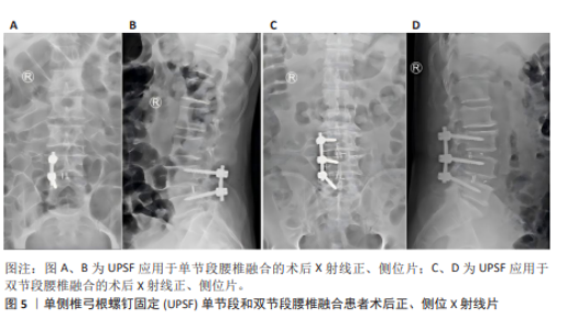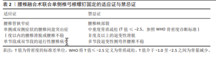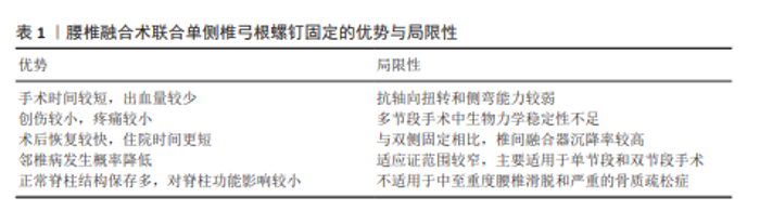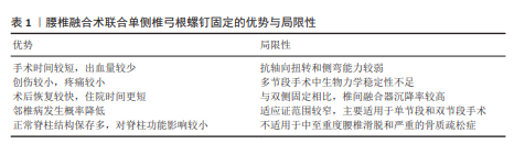 2.4 临床应用 2.4.1 临床疗效 腰椎退行性疾病严重影响中老年患者的生活质量,保守治疗无效时常需要通过手术干预。腰椎融合术联合UPSF作为一种微创手术方式,其围术期表现及术后长期疗效已在多项研究中得到验证。CHENG等[54]在一项前瞻性随机研究中,纳入了48例腰椎椎管狭窄症患者,比较了腰椎融合术联合UPSF与BPSF在术后2年的临床及影像学结果,研究结果显示两组患者的疼痛目测类比评分及Oswestry功能障碍指数均显著改善,且椎间隙高度、椎间孔高度及节段性前凸角度的恢复效果相似(均P > 0.05),但BPSF组的手术时间及术中失血量均显著高于UPSF组(均P < 0.05)。而YANG等[57]在对66例单节段腰椎退行性疾病患者的研究中发现UPSF组与BPSF组在术后目测类比评分及Oswestry功能障碍指数的改善方面无显著性差异(均P > 0.05),但UPSF组的手术时间与术中失血量分别减少了约24%和18%(均P < 0.05)。XUE等[58]开展的一项平均随访25.3个月的前瞻性随机研究表明,UPSF组在围术期表现方面优于BPSF组,而两组在总融合率、螺钉故障率及并发症发生率方面无显著性差异(均P > 0.05)。并且SUK等[65]在一项针对87例腰椎退行性疾病患者的研究中进一步验证了单侧固定的临床可行性,研究结果显示UPSF组在手术时间、住院时间及医疗费用方面均优于BPSF组(均P < 0.05),而两组在融合率、临床满意度及并发症发生率方面差异无显著性意义(均P > 0.05)。其他多项研究也表明UPSF在缓解症状、促进椎间融合及降低术后并发症方面的效果与BPSF相当,同时显著减少了手术创伤及术后恢复时间[18,66-70]。 近些年的临床研究大多只进行了术后短期效果随访(如2年随访),但对于术后长期疗效的研究仍相对缺乏,尤其是腰椎融合术联合UPSF术后的长期并发症包括螺钉松动、融合器沉降等尚未得到充分的关注。虽已有研究表明短期内UPSF组与BPSF组在疼痛缓解、功能改善等方面相似,但由于缺乏长期随访数据,关于这些手术的耐久性和长期并发症的分析仍不充分。所以未来的研究需要填补这一空白,重点关注长期并发症及手术耐久性,尤其是在骨质疏松、术后邻近节段退变等高风险患者群体中的表现。并且尽管上述研究肯定了腰椎融合术联合UPSF在腰椎退行性疾病治疗中的临床价值,但其在复杂病变中的安全性及疗效仍需通过更多高质量的随机对照研究加以验证。 2.4.2 优势与局限性 腰椎融合术联合UPSF作为一种新兴的内固定技术,在腰椎退行性疾病的治疗中展现出显著的微创优势(表1)。UPSF与传统的BPSF相比,明显缩短了手术时间和减少了术中出血量和透视次数,进而降低了围术期的风险。而且UPSF具有创伤较小的特点,可有效减少术后疼痛和软组织损伤,以便于加快患者的术后康复过程和缩短住院时间,并降低综合医疗费用。这些特点不仅使UPSF符合现代微创手术理念,同时为部分高龄患者或伴有基础疾病的患者提供了更为安全的治疗选择。UPSF还能通过降低内固定强度有助于减轻融合节段对邻近节段的应力集中,这有利于降低邻近节段退变的发生率。并且UPSF通过保留对侧正常的脊柱解剖结构,在维持脊柱稳定性与运动功能方面展现出独特优势,并且其生物力学性能能够满足单节段及部分双节段融合的临床应用需求。 但UPSF的局限性同样需要引起重视(表1)。UPSF在抗轴向扭转和侧屈应力方面的性能略低于BPSF,这种非对称固定的特性导致其在多节段融合或复杂病变患者中表现出一定的生物力学劣势。研究发现腰椎融合术联合UPSF的术后融合器沉降率高于BPSF,这可能对术后脊柱稳定性产生潜在的不利影响,尤其是在骨质疏松或椎间盘高度显著丧失的患者中表现更为显著。UPSF的适应证相对较为局限,主要适用于单节段或特定双节段的病变包括轻度腰椎滑脱、腰椎椎管狭窄或退行性椎间盘突出,但对于中度及以上的滑脱、多节段退变性侧弯或严重不稳定病变患者,BPSF可能仍是更优选择。 2.4.3 适应证与禁忌证 在腰椎退行性疾病的治疗中,由于微创的特性、较短的手术时间以及优良的临床效果,腰椎融合术联合UPSF已经逐渐开始在临床上普及。该术式对病例选择的要求较为严格,合理掌握其适应证与禁忌证对于手术的成功实施以及患者的长期预后具有关键意义(表2)。"