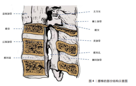 2.1 腰椎退行性疾病介绍 2.1.1 腰椎的结构和功能 腰椎是脊柱下部的重要组成部分,位于胸椎与骶椎之间,由5块椎体(L1-L5)及其相关的椎间盘、韧带、关节,以及周围的肌肉和筋膜共同构成[25-26](图4)。腰椎具有独特的解剖学特点,呈肾形的椎体较大且宽厚[27],这一解剖特征为腰椎承载上半身质量提供了良好的结构支持,并在日常活动中发挥支撑和稳定的作用。而位于椎体之间的椎间盘,其解剖结构由髓核、纤维环和软骨终板组成,具有缓冲负重、减震和分散应力的功能[28]。 腰椎主要具有前屈、后伸、侧屈及旋转等运动功能[29-31],尽管它的运动幅度小于颈椎,但腰椎的承重能力与稳定性更为突出[32-33]。腰椎的承重能力与稳定性依赖于多种结构的协调作用,主要包括椎间盘的弹性功能、椎体关节间的机械锁定、强大的韧带系统(如前纵韧带、后纵韧带、黄韧带、棘上韧带、棘间韧带等)以及附着于腰椎的多种肌群(如竖脊肌、多裂肌等)[26,29],这些结构相互协作,共同维持了腰椎的机械强度,同时赋予其一定的灵活性。 腰椎区域的神经结构复杂,主要包含马尾神经在内的多条神经根,这些神经根对下肢的感觉与运动功能以及膀胱和直肠的自主功能调节具有重要作用[26,34]。但长期的机械负荷、创伤以及老化所引起的退行性改变等因素易导致腰椎结构异常,并进一步加速腰椎退行性疾病的发生与发展[35-36]。 2.1.2 腰椎退行性疾病的病因病理和治疗现状 腰椎退行性疾病多发生于中老年人群,是以腰椎结构退行性改变为主要病理特征的脊柱疾病。目前腰椎退行性疾病的具体病因及其发病机制仍未完全阐明,学界普遍认为腰椎退行性疾病的发生是多种因素如遗传、年龄相关的椎间盘退变、长期的机械负荷以及创伤等综合作用的结果,其中遗传因素被认为是最重要的危险因素[37-38]。在病理层面,腰椎退行性疾病的主要特征是椎间盘退变、椎间隙狭窄、黄韧带肥厚以及关节突增生,这些病理改变共同导致腰椎稳定性下降,并可能诱发神经根受压及脊柱不稳。在临床表现方面,腰椎退行性疾病患者的主要症状通常以慢性腰背痛为主,并常伴随神经根性症状例如坐骨神经痛、下肢麻木或间歇性跛行等。症状严重的患者可能出现下肢无力或步态异常等表现,这些症状会显著降低患者的生活质量。 腰椎退行性疾病的治疗策略主要包括保守治疗和手术治疗[39-40]。对于症状轻微的患者常采用药物治疗、物理疗法以及生活方式干预等措施,而对于症状较为严重或长期保守治疗无效的患者则常需要进行手术干预。腰椎融合术已成为腰椎退行性疾病手术治疗的主要方式,在缓解神经压迫、恢复椎间隙高度以及重建脊柱稳定性方面表现出显著的治疗效果[14-15,41]。近年来微创技术的应用显著降低了手术创伤,并为患者提供了更加优化的治疗选择。"