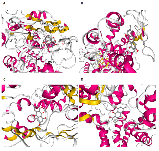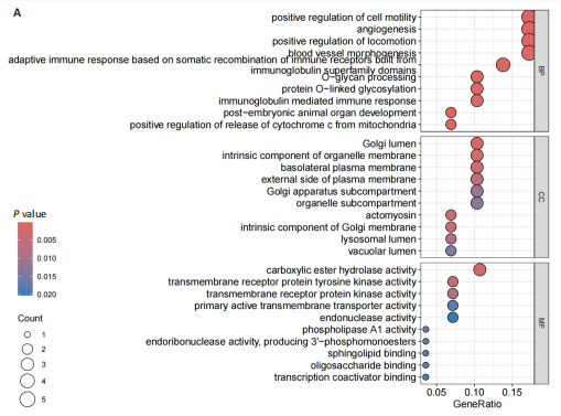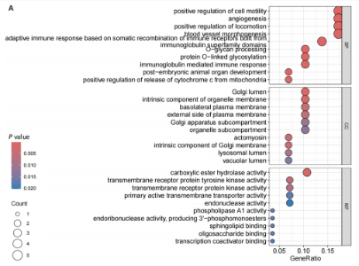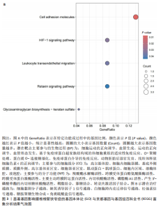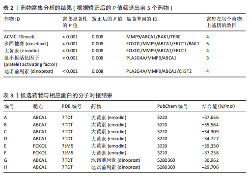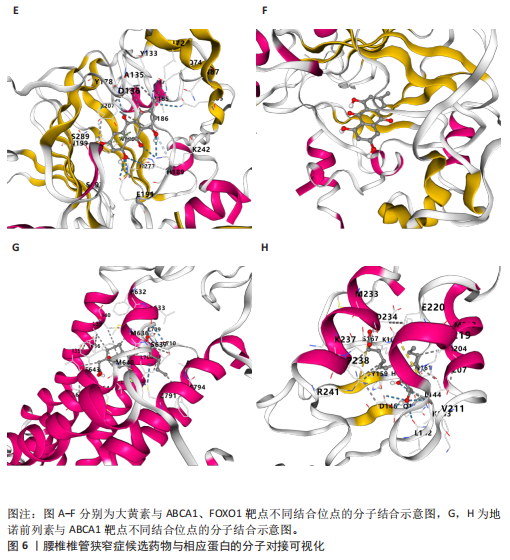 2.1 孟德尔随机化分析及有效基因的筛选 此次研究共筛选出来32个显著潜在基因,具体数据细节见表1,将其进行可视化(图1)。 2.2 共定位分析结果 结果表明在32个显著基因中,CCDC77的PP.H4为0.859,CCDC77与腰椎椎管狭窄症均可被rs7298019驱动结果表明CCDC77与腰椎椎管狭窄症有着较强的关联性,将以上结果进行可视化(图2)。 2.3 显著基因功能分析 对32个潜在靶点进行GO富集分析,可以看出,这些靶点共参与319项生物学过程(BP),涉及27个细胞组分(CC),包括33个主要分子功能(MF)。其中主要参与的生物学过程有细胞运动的正向调节(GO2000147、GO0040017)、血管生成(GO0001525、GO0048514)及与适应性免疫应答相关的生物代谢过程(GO0002460、GO0002250);主要细胞组分有高尔基体相关组分(GO0005796、GO0098791)、细胞器膜(GO0031300)、基底外侧质膜(GO0016323)、细胞器亚区(GO0031984)、肌动球蛋白(GO0042641);主要分子功能包括羧酸酯水解酶活性(GO0052689)、跨膜受体蛋白激酶活性(GO0004714、GO0019199)及核酸内切酶活性(GO0004519),见图3A。 KEGG通路富集展示了腰椎椎管狭窄症相关的显著可用药基因的5条潜在治疗通路,根据富集在每个药物上基因的数目及显著性,排名前3的是细胞黏附分子通路、缺氧诱导因子1信号通路、白细胞跨内皮迁移信号通路(图3B)。 2.4 蛋白互作网络分析 在将32个显著基因构建蛋白互作网络后,隐藏网络中断开的网络节点,共得到32个节点和91个边缘,平均节点度为5.69,预期边数为44,蛋白互作网络富集P值=0.045 3。将结果导出并进行可视化,见图4。 2.5 药物富集结果 将32个显著基因与DSigDB下载的数据进行富集分析后,得到182个药物,将以上结果进行可视化(图5),以矫正后的P值筛选出前5个药物为例,见表2。 2.6 分子对接结果 使用CB-Dock2在线工具分析与相应基因编码蛋白质亲和力强的前2种候选药物与相应基因编码蛋白质之间的结合位点和相互作用,相互作用产生结合能,结合能越低,结合效果越好,亲和力越高。获得了8个蛋白质与药物之间的有效对接结果(表3),由A-H编号,将结果可视化,见图6。"