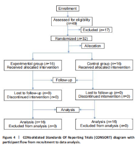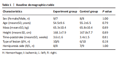 Results The number of subjects included in the study A total of 49 patients with early-stage stroke were screened, of whom 32 met the eligibility criteria and were randomized to undergo the intervention, as illustrated in Figure 4. A comparison of baseline characteristics, presented in Tables 1 and 2, revealed no statistically significant differences in demographic or clinical features among the participants (P > 0.05). "