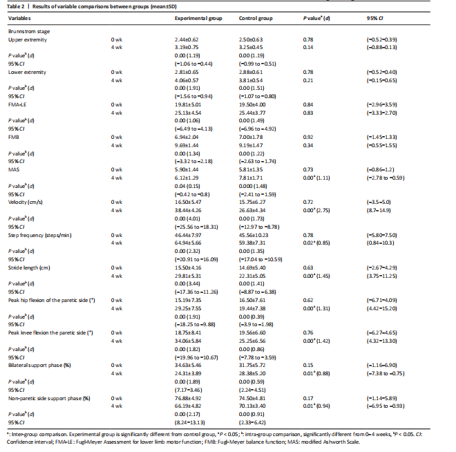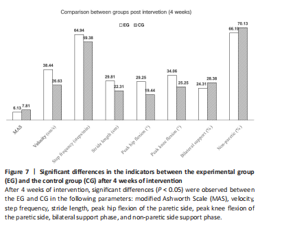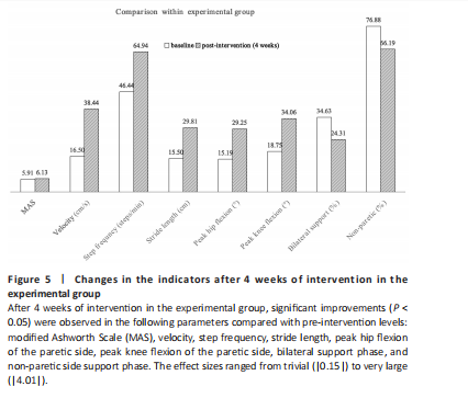 Both groups demonstrated statistically significant improvements in peak flexion angles of the hip and knee joints (P < 0.05), along with significant reductions in both bilateral and non-paretic support phases (P 0.05). Following a 4-week intervention, the EG demonstrated statistically significant improvements in gait parameters compared to the CG. Specifically, EG exhibited a 28.6% increase in walking velocity (from 26.63 cm/s to 38.44 cm/s; P < 0.05), with a very large treatment effect size (d=|2.75|). Additionally, EG showed significant and substantial increases in other kinematic outcomes: Stride length increased by 25.3% (from 22.31 cm to 29.81 cm; P < 0.05, d=|1.45|), peak hip flexion improved by 33.5% (from 19.44° to 29.25°; P < 0.05, d=|1.31|), and peak knee flexion increased by 25.9% (from 25.25° to 34.06°; P < 0.05, d = 1.42). Moderate yet statistically significant differences were observed in temporal-spatial parameters. Specifically, step frequency exhibited a significant increase (64.94 steps/min vs. 59.38 steps/min; P < 0.05, d=|0.85|). Concurrently, the support phase decreased significantly: bilaterally, it was reduced from 28.375% to 24.31% (P < 0.05, d=|0.88|), and in the non-paretic side, it decreased from 70.13% to 66.19% (P < 0.05, d=|0.94|). Adverse reaction analysis None of the test subjects experienced adverse reactions during the trial."