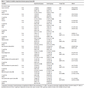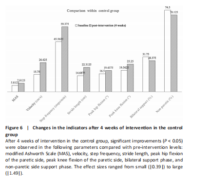 Analysis of differences in outcome indicators among groups of subjects Changes in the indicators after 4 weeks of intervention in the control group and experimental group are shown in Figures 5–7. After 4 weeks, the MAS scores exhibited minimal changes in both groups. The experimental group showed a slight but statistically significant increase (from 5.91 to 6.13, P < 0.05, d=|0.15|), whereas the control group demonstrated a substantial increase (from 5.81 to 7.81, P < 0.05, d=|1.48|). Post-intervention, the MAS scores in the control group were significantly higher than those in the experimental group (7.81 vs. 6.13, P < 0.05, d=|1.11|). Among the spatiotemporal gait parameters assessed, the experimental group displayed highly significant and clinically meaningful improvements in gait velocity (from 16.5 to 38.44 cm/s, P < 0.05, effect size d=|4.01|), step frequency (from 46.44 to 64.94 steps/min, P < 0.05, d=|2.32|), and stride length (from 15.50 to 29.81 cm, P < 0.05, d=|3.44|). In contrast, the control group exhibited changes of greater magnitude but with moderate effect sizes (d=|1.35| to |1.73|) for the same parameters post-intervention."