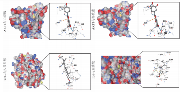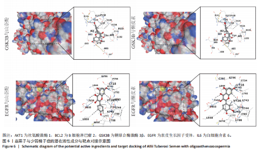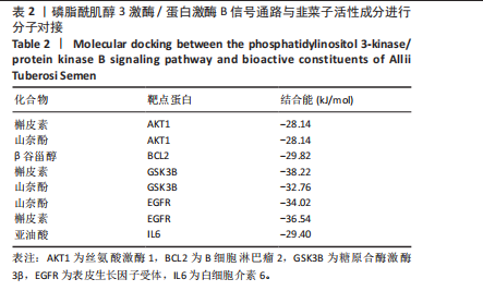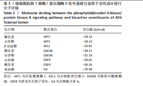 2.2 交集基因及成分-靶点-疾病关系网络构建 通过GeneCards、DrugBank、Disgenet、OMIM数据库共获取1 095个靶标。将疾病靶点与药物有效成分靶点相互交集并绘制韦恩图,最后获取韭菜子治疗少弱精子症的靶点基因共123个,构建成分-靶点-疾病关系网络,见图1,2。 2.3 蛋白互作网络分析 基于String数据库构建123个靶点基因的蛋白质互作网络,筛选综合评分> 0.4的互作关系通过Cytoscape软件可视化(图3),并运用CytoNCA和CytoHubba插件分析网络拓扑结构,最终按Degree值排序确定前10个核心靶点蛋白,具体包括丝氨酸激酶1(AKT1)、B细胞淋巴瘤2(BCL2)、缺氧诱导因子1(HIF1A)、雌激素受体1(ESR1)、肿瘤坏死因子(TNF)、胱天蛋白酶3 (CASP3)、白细胞介素6(IL6)、前列腺素内过氧化物合酶2(PTGS2)、表皮生长因子受体(EGFR)、糖原合酶激酶3β(GSK3B),见图4。 2.4 GO富集分析及KEGG通路富集分析 GO富集分析得到总条目290个,其中生物过程290个条目,主要涉及对异源性刺激的反应、对有毒物质的反应、miRNA转录的正调控、对一氧化氮生物合成过程的积极调节、核糖核酸聚合酶Ⅱ对转录的正调控、细胞质钙离子浓度的正调控、炎性应答、脂多糖的细胞反应、脱氧核糖核酸模板转录的正调控、胆固醇内稳态;细胞组成49个条目,主要包括内质网膜、细胞膜、含蛋白质复合物、内质网、胞外小泡、神经元细胞体、膜、细胞表面、膜桥、胞质等;分子功能101个条目,主要包括核受体活性、类固醇结合、酶结合、转录共激活因子结合、锌离子结合、相同的蛋白质结合、核类固醇激素受体活性、雌激素反应元件结合、序列特异性DNA结合、蛋白质同源二聚化活性等,每组选取前10个条目生成可视化三合一柱状图。KEGG通路富集分析获得51条通路,主要涉及胆汁分泌、乙型肝炎、内分泌抵抗、高级糖基化终末产物-受体信号通路、在糖尿病并发症中的作用、麻疹、阿米巴病、磷脂酰肌醇3激酶/蛋白激酶B信号通路、肿瘤坏死因子信号通路、蛋白多糖在癌症中的作用、转录因子的叉头盒O信号通路、p53信号通路、细胞凋亡、甲状腺激素信号通路,见图5。 2.5 分子对接 通过以上结果表明磷脂酰肌醇3激酶/蛋白激酶B是韭菜子改善雷公藤多苷片诱导少弱精子症的关键通路,对通路中关键蛋白进行分子对接,从PDB数据库获取丝氨酸激酶1(7myx)、B淋巴细胞瘤2蛋白(5uup)、白细胞介素6(5sfk)、表皮生长因子受体(9gdv)、糖原合酶激酶3β(8vmf)的蛋白结构文件。通过分子对接分析显示所有配体-靶点复合物的结合能均低于-25.2 kJ/mol,提示具有强效结合活性,见表2,图6。 2.6 动物实验验证结果 2.6.1 韭菜子对少弱精子症大鼠体质量、睾丸质量、精子计数和活力的影响 与空白组相比,模型组大鼠"