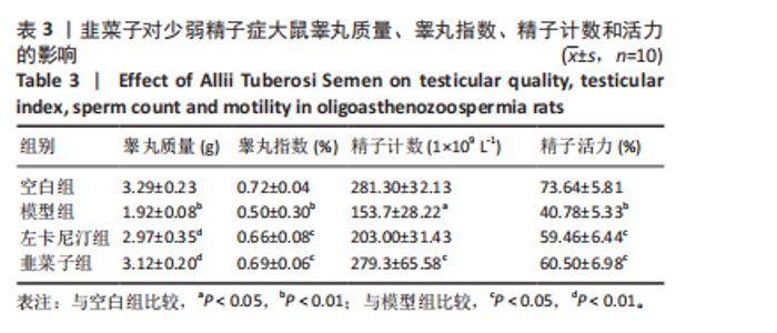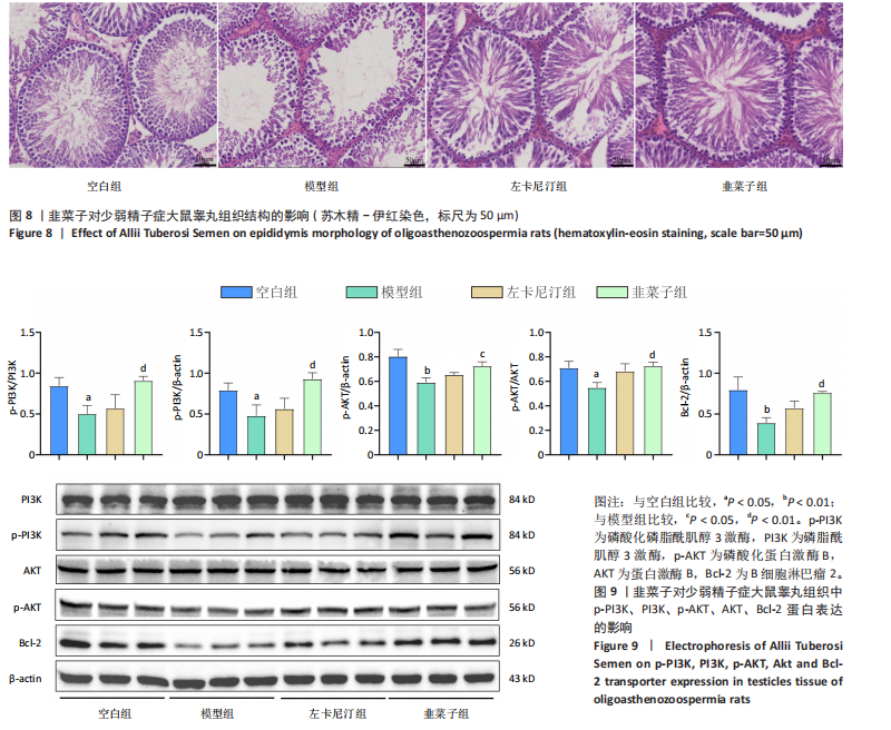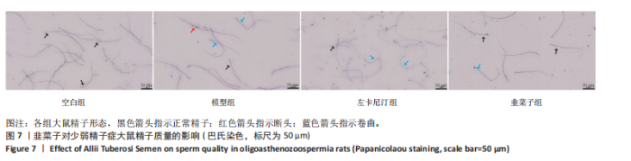 2.6.2 韭菜子对少弱精子症大鼠精子质量的影响 大鼠正常精子头部弯曲、呈镰刀型、表面光滑、顶体和顶体后区分界欠清晰、头颈部连接于腹侧、颈部细长、中段粗细一致、主段较长、逐渐变细及无成角弯折,左卡尼汀组与韭菜子组精子形态与正常精子无异,模型组精子畸形,主要有断头、卷曲、尾部折叠,结果表明韭菜子组对少弱精子症大鼠精子损伤具有改善作用,见图7。 2.6.3 韭菜子对少弱精子症大鼠睾丸组织结构的影响 苏木精-伊红染色显示:空白组大鼠睾丸生精小管结构完整,生精细胞排列有序;模型组则呈现生精小管萎缩、生精细胞排列紊乱及数量显著减少的病理改变;而韭菜子组和左卡尼汀组大鼠睾丸组织学结构明显改善,生精细胞排列基本恢复正常,见图8。 2.6.4 韭菜子对少弱精子症大鼠血清指标的影响 与空白组比较,其余各组血清睾酮水平均降低,卵泡"