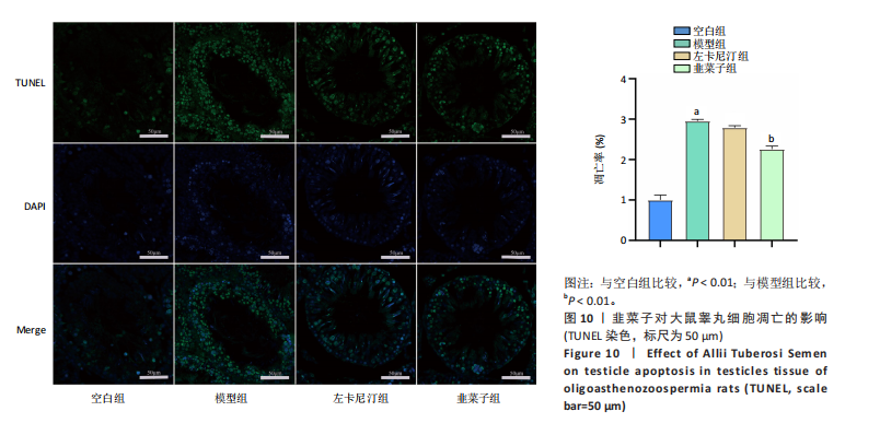 2.6.5 韭菜子对少弱精子症大鼠睾丸组织中相关蛋白表达水平的影响 与空白组相比,模型组大鼠睾丸组织中磷酸化磷脂酰肌醇3激酶、磷酸化蛋白激酶B及B细胞淋巴瘤2蛋白表达水平均显著下调(P < 0.01,P < 0.05);经药物干预后,韭菜子组、左卡尼汀组上述蛋白表达上调,其中韭菜子组对磷脂酰肌醇3激酶/蛋白激酶B信号通路的激活作用尤为显著(P < 0.01,P < 0.05),见图9。 2.6.6 韭菜子对少弱精子症大鼠睾丸细胞凋亡的影响 TUNEL检测结果显示:模型组大鼠睾丸组织细胞凋亡率较空白组显著升高(P < 0.01);经药物干预后,韭菜子组能显著抑制睾丸细胞凋亡(P < 0.01),见图10。"