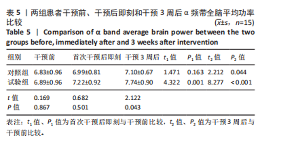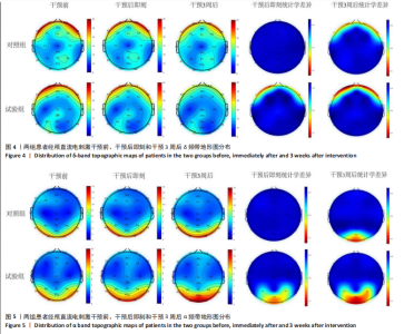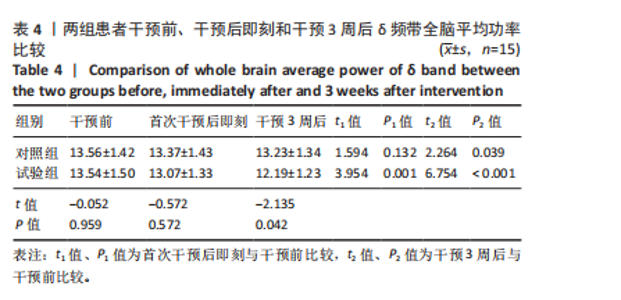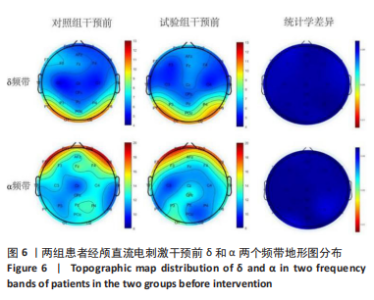 2.6 功率谱密度分析结果 2.6.1 δ频带能量地形图 施加真、伪tDCS前,δ频带能量主要集中在额叶和颞叶区。首次施加伪tDCS后,δ频带能量较干预前无明显变化(P > 0.05);经3周伪tDCS干预后,δ频带能量较干预前在额叶和颞叶区降低(P < 0.05)。首次施加双极tDCS后,δ频带能量较干预前在额叶和颞叶区降低(P < 0.05);经3周tDCS干预后,δ频带能量较干预前在额叶和颞叶区降低(P < 0.05),见图4。 2.6.2 α频带能量地形图 施加真、伪tDCS前,α频带能量主要集中在顶叶和枕叶区。首次施加伪tDCS后,α频带能量较干预前无明显变化(P > 0.05);经3周伪tDCS干预后,α频带能量较干预前在枕叶区升高(P < 0.05)。首次施加双极tDCS后,α频带能量较干预前在顶叶和枕叶区升高(P < 0.05);经3周tDCS干预后,α频带能量较干预前在顶叶和枕叶区升高(P < 0.05),见图5。真伪tDCS刺激前δ、α频带能量无显著性差异(P > 0.05),见图6。 2.7 δ、α全脑平均功率比较 2.7.1 干预前后两组患者δ频带全脑平均功率比较 与干预前比较,试验组干预后即刻δ频带全脑平均功率降低(P < 0.05),两组δ频带全脑平均功率组间无显著性差异(P > 0.05);干预3周后,两组δ频带全脑平均功率较干预前均降低(P < 0.05),试验组显著低于对照组(P < 0.05),见表4。"