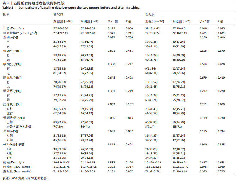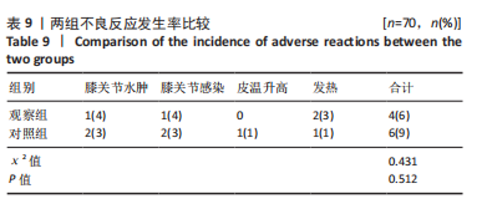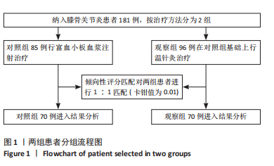 METHODS: A total of 181 patients with knee osteoarthritis admitted to Sanming Integrated Medicine Hospital from February 2020 to March 2024 were selected as the study objects. According to the treatment methods, they were divided into an observation group (n=96) and a control group (n=85). The control group was given platelet-rich plasma injection therapy, and the observation group was given warm acupuncture combined with platelet-rich plasma injection therapy. After matching at a 1:1 ratio using propensity score matching, each group consisted of 70 cases. The general data, gait parameters, joint function, and occurrence of adverse reactions were compared between the two groups before and after treatment. The generalized estimation equation model was used to analyze gait parameters before and after treatment. The relationship between gait parameters and joint function was analyzed using Logistic regression analysis and correction model. The difference-in-differences model was used to evaluate the therapeutic effect before and after treatment.