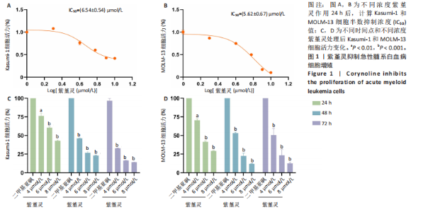 METHODS: Human acute myeloid leukemia cell lines Kasumi-1 and MOLM-13 were cultured in vitro and treated with varying concentrations of corynoline (4, 6, and 8 μmol/L), with dimethyl sulfoxide used as a control. The cell viability was detected using CCK-8 assay for 24, 48, and 72 hours, and the pharmacological activity of corynoline was assessed by flow cytometry. The target genes for corynoline treatment of acute myeloid leukemia were predicted using network pharmacology. Potential mechanisms were analyzed through GO and KEGG analysis. A protein interaction network was constructed, and core targets were identified using clinical correlation analysis. The binding affinity to these core targets was assessed through molecular docking and molecular dynamics simulations. Finally, the molecular mechanisms by which corynoline treats acute myeloid leukemia were evaluated using quantitative reverse transcription-polymerase chain reaction and Western blot assays.