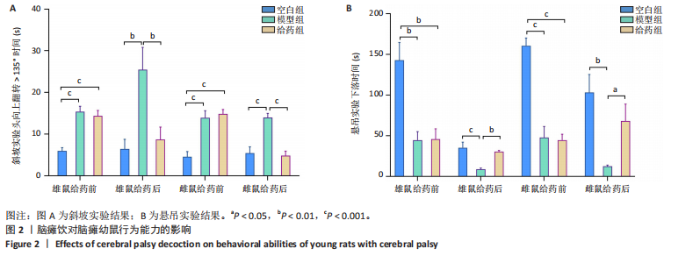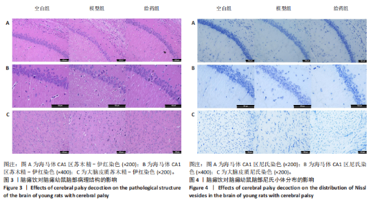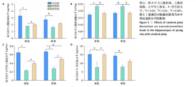2.1 实验动物数量分析 共纳入正常与脑瘫幼鼠共54只(每组雌雄各9只),54只全部进入结果分析,无脱落。 2.2 脑瘫饮对脑瘫幼鼠行为学的影响 脑瘫疾病主要表现为四肢运动功能障碍,通过行为学评分可判断脑瘫幼鼠的运动功能状态进而判断该疾病的恢复程度。 2.2.1 斜坡实验 给药前,与空白组比较,模型组与给药组皆有显著性差异(雄鼠P < 0.001,雌鼠P < 0.001),模型组与给药组之间无显著性差异;给药后,与模型组比较,空白组与给药组皆有显著性差异(雄鼠P < 0.01,雌鼠P < 0.001),空白组与给药组之间无显著性差异(图2A)。 2.2.2 悬吊实验 给药前,与空白组比较,模型组与给药组皆有显著性差异(雄鼠P < 0.01,雌鼠P < 0.001),模型组与给药组之间无显著性差异;给药后,与模型组比较,空白组与给药组皆有显著性差异(雄鼠P < 0.001,P < 0.01,雌鼠P < 0.01,P < 0.05),空白组与给药组之间无显著性差异(图2B) 2.3 脑瘫饮对脑瘫幼鼠脑部病理结构的影响 海马体在记忆、学习、方向定位以及情绪调节等方面发挥着重要作用,大脑皮质在感觉处理、高级认知功能、运动控制以及情感和行为等方面发挥重要作用[10]。神经元则在接收与处理信息、参与感觉与运动等方面起着极其重要的作用[11]。观察海马体与大脑皮质的组织形态和神经元状态,可间接判断脑部的功能。海马体与大脑皮质苏木精-伊红染色显示:空白组海马体CA1区的神经元细胞排列整齐紧密,由四五层细胞排列组成,且层次清晰,染色均匀,细胞形态规则,核仁清晰可见,胞浆较为丰满;神经突起整齐且清晰可见;皮质区细胞的形态结构也未见异常。与空白组相比,模型组海马体CA1区神经元细胞明显减少甚至裂解消失,排列较为散乱,细胞层级显著减少且层次之间出现间隙,核固缩、核裂解现象明显;神经突起较为散乱;皮质区的神经元细胞固缩深染,且形态不规则,坏死现象明显。与模型组相比,给药组海马体CA1区的细胞数量均有不同程度增加,病理性改变减少,且排列较规整,细胞间隙减少,脱垂,核固缩坏死及溶解现象也明显减少;神经突起排列也较为整齐;皮质区神经元固缩坏死现象减少(图3)。 2.4 脑瘫饮对脑瘫幼鼠脑部尼氏小体分布的影响 尼氏小体主要分布于神经元内,是神经元胞体内的嗜碱性斑块或颗粒,由粗面内质网和游离核糖体组成,具有合成更新细胞结构蛋白、神经递质及神经激素的作用,与神经元的营养和代谢密切相关。作为神经元内合成蛋白质的主要物质,尼氏小体数量的多少间接反映神经元功能状态[12]。海马体与大脑皮质尼氏染色显示:空白组海马体CA1区的尼氏小体体积较大且数量较多,细胞染色较深,核仁清晰;神经突起较为明显且排列紧密有序;皮质区尼氏小体数量较多且排列较为紧密。与空白组相比,模型组海马体CA1区尼氏小体数量明显减少,体积小,甚至消失,且染色较浅;神经突起较紊乱;皮质区尼氏小体数量明显减少且排列稀疏。与模型组相比,给药组海马体CA1区尼氏小体数量显著增加,颗粒大且多见,排列整齐,染色较深;神经突起较为明显;皮质区尼氏小体数量显著增加(图4)。 2.5 脑瘫饮对脑瘫幼鼠海马体中神经递质水平的影响 2.5.1 海马体中乙酰胆碱水平 乙酰胆碱主要分布于中枢和外周神经系统中,起着促进腺体分泌、降低神经肌肉兴奋性、舒张血管、改善微循环以及促进神经传递和调节肌肉运动等至关重要的作用。空白组乙酰胆碱水平显著高于模型组(雄鼠P < 0.001,雌鼠P < 0.01);给药组乙酰胆碱水平高于模型组(雄鼠P < 0.05,雌鼠无显著性差异)。而空白组与给药组之间雌雄鼠乙酰胆碱水平均无显著性差异(图5A)。 2.5.2 海马体中乙酰胆碱酶水平 乙酰胆碱酶是水解乙酰胆碱的主要酶,通过影响乙酰胆碱水平进而影响多种生理功能(乙酰胆碱酶水平越高,相对而言乙酰胆碱水平越低)。空白组乙酰胆碱酶水平显著低于模型组(雄鼠P < 0.001,雌鼠P < 0.01);给药组乙酰胆碱酶水平显著低于模型组(雄鼠P < 0.01,雌鼠P < 0.01)。空白组与给药组之间雌雄鼠乙酰胆碱酶水平均无显著性差异(图5B)。 2.5.3 海马体中去甲肾上腺素水平 去甲肾上腺素主要为神经末梢释放的神经递质,对血管收缩、心脏兴奋、血压升高等产生重要的影响,同时去甲肾上腺素还起着抗休克等重要的反馈作用。空白组去甲肾上腺素水平显著高于模型组(雄鼠P < 0.001,雌鼠 P < 0.001);给药组去甲肾上腺素水平显著高于模型组(P < 0.05,雌鼠P < 0.001)。空白组去甲肾上腺素水平高于给药组(雄鼠无显著性差异,雌鼠P < 0.01)(图5C)。 2.5.4 海马体中5-羟色胺水平 5-羟色胺是一种广泛存在于大脑皮质及神经突触中的兴奋性神经递质,影响大脑活动的各个方面,主要影响情绪与精神等脑神经,同时对免疫系统、胃肠功能、心脑血管方面以及记忆功能都有着不可忽视的作用[13-14]。空白组5-羟色胺水平显著高于模型组(雄鼠P < 0.05,雌鼠P < 0.01);给药组5-羟色胺水平高于模型组(雄鼠P < 0.05,雌鼠无显著性差异)。空白组与给药组之间雌雄鼠5-羟色胺水平无显著性差异(图5D)。 2.6 脑瘫饮对脑瘫幼鼠大脑皮质(额叶)中神经递质水平的影响 2.6.1 大脑皮质中乙酰胆碱水平 空白组雄鼠大脑皮质中乙酰胆碱水平显著高于模型组(P < 0.01);给药组雄鼠大脑皮质中乙酰胆碱水平高于模型组(P < 0.05);空白组与给药组之间乙酰胆碱水平无显著性差异。而雌鼠大脑皮质中各组乙酰胆碱水平均无显著性差异(图6A)。 2.6.2 大脑皮质中