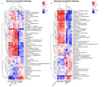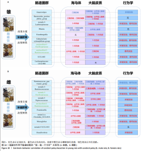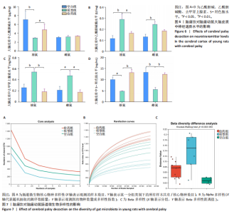 系和丰富度来衡量样本之间的距离,从而反映样本(组)之间微生物群落是否存在显著差异。各组组内离散程度分析:模型组组内离散程度最高,给药组次之,空白组最低;各组组间Beta多样性距离分析:给药组与空白组的组间距离小于模型组与空白组的组间距离(图7C)。 2.8 脑瘫饮对脑瘫幼鼠肠道微生物组成的影响 各组之间肠道微生物组成的差异性,从一定程度上也反映出此类疾病的优势菌群及劣势菌群。该研究分析属类菌群并截取前10个菌群进行分析,由菌落组成差异图可知,治疗脑瘫疾病的优势菌群有:norank_f__Muribaculaceae属;norank_f__Oscillospiraceae属;大肠杆菌属(Colidextribacter);Lachnospiraceae_UCG-006属4个菌群。劣势菌群有:乳酸杆菌属(Lactobacillus)1个菌群(图8A)。 由Ternary三元图可知,治疗脑瘫疾病的优势菌群有:norank_f__Oscillospiraceae属;大肠杆菌属(Colidextribacter);norank_f__Muribaculaceae属;unclassified_f__ Lachnospiraceae属4个菌群。劣势菌群有:乳酸杆菌属(Lactobacillus);经黏液真杆菌属(Blautia)2个菌群(图8B)。 2.9 Spearman相关性分析 通过属水平得到肠道菌群与海马体神经递质水平(乙酰胆碱1、乙酰胆碱酶1、5-羟色胺1、去甲肾上腺素1)、大脑皮质神经递质水平(乙酰胆碱2、乙酰胆碱酶2、5-羟色胺2、去甲肾上腺素2)以及行为学(斜坡实验、悬吊实验)进行Spearman相关性分析,从而得到肠道菌群与相关检测指标的正/负相关性。由此可知,在雄鼠中,粪厌氧棒杆菌(Anaerostipes);拟杆菌属Bacteroides_pectinophilus_group属;norank-f-Lachnospiraceae属;经黏液真杆菌属(Blautia);梭菌属(Eisenbergiella);Eubacterium-xylanophilum-group属;unclassified-f-Oscillospiraceae属;unclassified-f-Ruminococcaceae属;普雷沃氏菌属(UCG-003);Lachnospiraceae-UCG-006属10个菌群与各个指标相关性更强(图9A)。在雌鼠中,Ruminococcus_gauvreauii_group属;norank-f-Ruminococcaceae属;norank-f-Oscillospiraceae属;norank-f-Peptococcaceae属;unclassified-f-Ruminococcaceae属;韦荣氏球菌属(Fournierella);noran-k-o-Clostridia_UCG-014属;Monoglobus属;norank-f-UCG-010属;脱硫弧菌属(Desulfovibrio)10个菌群与各个指标相关性更强(图9B)。 各指标相关性,在雄鼠中,斜坡实验、去甲肾上腺素2、乙酰胆碱酶1、乙酰胆碱酶2指标之间关联性更强;悬吊实验、去甲肾上腺素1、乙酰胆碱1、乙酰胆碱2、5-羟色胺1、5-羟色胺2指标之间关联性更强;而在雌鼠中,斜坡实验、去甲肾上腺素2、乙酰胆碱酶1、乙酰胆碱酶2、乙酰胆碱2指标相关性更强;悬吊实验、去甲肾上腺素1、乙酰胆碱1、5-羟色胺1、5-羟色胺2指标之间相关性更强(图9C,D)。 2.10 脑肠轴相关性分析 根据图9的数值相关性,取与指标相关性前10个肠道菌群,依据正常指标数值高/低,从而统计出正向/负向相关性。由图10可知,在雄鼠中,粪厌氧棒杆菌(Anaerostipes)、norank-f-Lachnospiraceae属、梭菌属(Eisenbergiella)、Eubacterium-xylanophilum-group属、unclassified-f-Oscillospiraceae属、unclassified-f-Ruminococcaceae属、普雷沃氏菌属(UCG-003)、Lachnospiraceae-UCG-006属8个菌群与行为学具有相关性;在这8个菌群中,只有粪厌氧棒杆菌与各检测指标呈负相关,其余梭菌属和普雷沃氏菌属等7个菌群与各检测指标均呈正相关。在雌鼠中,Ruminococcus_gauvreauii_group属、norank-f-Ruminococcaceae属、norank-f-Oscillospiraceae属、norank-f-Peptococcaceae属、unclassified-f-Ruminococcaceae属、弗朗西斯氏菌属 (Fournierella)、noran-k-o-Clostridia_UCG-014属、Monoglobus属、脱硫弧菌属(Desulfovibrio)9个菌群皆与行为学具有相关性;在这9个菌群中,只有Ruminococcus_gauvreauii_group属1个菌群与各检测指标呈负相关,脱硫弧菌属和弗朗西斯氏菌属等8个菌群与各检测指标间均呈正相关。由此可知,雌雄鼠的肠道菌群与脑神经递质之间关系极为密切,并且可以影响脑瘫幼鼠行为学。 雌雄鼠中与各指标相关性前10个菌群中,只有norank-f-Oscillospiraceae属和unclassified-f-Ruminococcaceae属两类菌群是雌雄共有的。其他所有菌群中,粪厌氧棒杆菌(Anaerostipes)、Bacteroides_pectinophilus_group属和norank-f-Lachnospiraceae属等8个菌群为脑瘫雄鼠所独有;Ruminococcus_gauvreauii_group属、norank-f-Ruminococcaceae属和norank-f-Peptococcaceae属等8个菌群为脑瘫雌鼠所独有。"