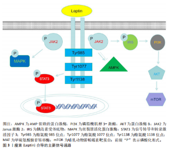 性的形态[16]。除白色脂肪组织外,瘦素还存在于其他多种组织中,如乳腺、卵巢、胎盘、垂体、骨骼肌、胃、淋巴组织、间充质干细胞及骨组织[17],但白色脂肪细胞是瘦素最主要的分泌来源。血清瘦素水平与体脂含量呈正相关关系,因此瘦素主要反映了机体脂肪组织中的能量储备状况[18]。瘦素表达和循环浓度不仅呈现昼夜节律性波动,还会随营养状态的改变而变化。瘦素分子的氨基末端含有一段由21个氨基酸残基组成的信号肽序列,负责引导前体分子进入分泌途径[19],分泌入血清的成熟瘦素分子则是该信号肽被切除后形成的由146个氨基酸残基构成的肽链[20]。 瘦素的合成与分泌受控于复杂的内分泌、神经内分泌及旁分泌信号网络。总体而言,瘦素的分泌水平与体质量及营养状态呈正相关,例如,饥饿状态下血清瘦素水平显著下降,这是机体对能量缺乏状态的适应性生理反应。此外,皮下脂肪组织相较于内脏脂肪组织具有更高的瘦素分泌能力[21]。瘦素的分泌受到多种生理因素的调节,这些因素包括体脂分布、性别、年龄、青春期阶段、禁食、进食状态以及运动等,同时还受多种激素的影响。胰岛素是瘦素生成的关键调节因子,长期高胰岛素血症可导致血浆瘦素浓度升高,而短期高胰岛素血症对血浆瘦素浓度则无明显影响。在人体研究中,胰岛素输注可增加血浆瘦素浓度;相反,儿茶酚胺则通过结合β2-肾上腺素能受体和β3-肾上腺素能受体来抑制瘦素合成;此外,皮质类固醇和肿瘤坏死因子α能刺激瘦素合成,而甲状腺激素对瘦素可能起抑制作用[21]。 在骨代谢领域,瘦素与脂联素形成了复杂的相互作用网络,二者通过协同与拮抗作用共同维持骨稳态。瘦素具有中枢抑制与外周促进的双重调控特性:瘦素通过下丘脑-交感神经轴间接抑制骨形成,同时又可激活成骨细胞内的Janus激酶2/信号传导和转录激活蛋白3信号通路直接促进骨矿化。脂联素通过其受体激活AMP依赖的蛋白激酶通路,进而刺激成骨分化、抑制炎症因子介导的骨破坏。在骨髓微环境中,这两种脂肪因子保持动态平衡:瘦素促进骨髓间充质干细胞向成骨细胞分化,脂联素抑制骨髓间充质干细胞向脂肪细胞分化,共同调控着成骨与成脂分化的相对比例[22]。 大量研究表明,瘦素在肥胖、免疫、生殖、循环、癌症发生发展、牙周炎、骨生成及阻塞性睡眠呼吸暂停等过程中发挥着重要的生理与病理作用[23-28]。 2.2.2 瘦素的受体及信号通路 瘦素受体是Ⅰ类细胞因子受体家族成员,广泛表达于中枢神经系统及外周组织。根据胞内结构域的长度和氨基酸序列差异,瘦素受体主要分为长型、短型和可溶3种亚型。目前已鉴定的瘦素受体异构体a、瘦素受体异构体b、瘦素受体异构体c、瘦素受体异构体d、瘦素受体异构体e和瘦素受体异构体f 6种异构体均由db基因通过转录后可变剪接产生[16]。所有异构体均含有配体结合的共有胞外结构域,但羧基末端的胞内结构域则显著不同,其中瘦素受体异构体e因独特的缺乏跨膜结构域(即仅含胞外域)成为可溶性异构体,能够结合循环中的瘦素并阻碍它向中枢转运,其余5种异构体具有完全一致的胞外域和跨膜域。 在具有完整结构的受体中,瘦素受体异构体b因胞内区包含全部功能性结构域而最为关键,瘦素与瘦素受体异构体b结合后可启动下游多重信号传导。瘦素受体自身无酶活性,但可结合并激活胞质酪氨酸激酶Janus激酶2。瘦素结合诱导受体构象改变,触发Janus激酶2分子间的反式自磷酸化,进而激活包括丝裂原活化蛋白激酶、Janus激酶/信号传导和转录激活蛋白、磷脂酰肌醇3-激酶-蛋白激酶B、AMP依赖的蛋白激酶和哺乳动物雷帕霉素靶蛋白在内的多条信号级联通路。最新研究发现,瘦素受体异构体b的乙酰化修饰能增强瘦素信号敏感性;药理学抑制组蛋白去乙酰酶6可显著逆转饮食诱导的肥胖,但具体机制尚未完全阐明,推测可能涉及脂肪源性的循环因子或中枢直接调控瘦素受体异构体b乙酰化状态[29]。 瘦素受体作为跨系统调控的核心分子,它的功能已超越经典的代谢调控,比如通过Janus激酶 2/信号传导和转录激活蛋白 3、磷脂酰肌醇3-激酶/蛋白激酶B/哺乳动物雷帕霉素靶蛋白通路调控能量平衡及乳腺脂质合成,现已拓展至骨骼重塑、神经免疫及病理适应等多个领域[30]。近期研究揭示血管生成素样蛋白4可作为瘦素受体的第二配体,在应激状态下通过结合骨髓间充质细胞上的瘦素受体驱动异位骨化,这解释了瘦素受体突变小鼠与瘦素缺乏小鼠之间的表型差异[7]。在骨稳态维持中,瘦素受体通过信号转导和转录激活因子3非依赖性途径支持皮质骨矿化,瘦素功能缺失会加剧骨孔隙率及低密度骨比例[31]。同时,骨髓基质细胞表达的瘦素受体与交感神经形成双向交互,骨髓基质细胞分泌神经生长因子维持神经存活,而交感神经通过β-肾上腺素能信号反馈促进再生因子释放,共同加速骨髓修复[32]。在脂肪组织内,存在于交感神经周围的屏障细胞通过分泌白细胞介素33调控棕色脂肪组织的免疫微环境,对维持脂肪组织产热功能及代谢稳态至关重要;屏障功能失调可导致局部炎症加剧、瘦素抵抗及肥胖易感性增加[33]。此外,可溶性瘦素受体通过动态调节循环瘦素生物利用度参与代谢性疾病进程[34]。这些突破性进展不仅重塑了瘦素受体作为“多配体-多通路”信号整合中心的生物学意义,也为肥胖、异位