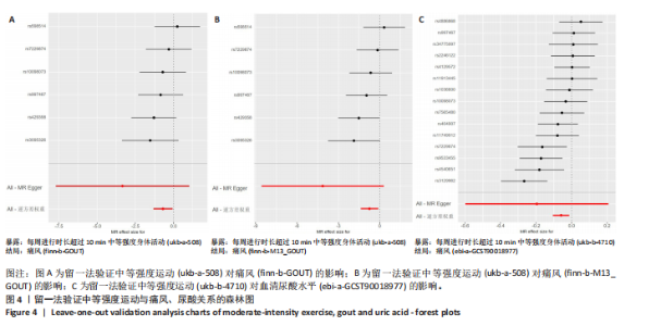 2.1 孟德尔随机化 如图2所示,以逆方差加权法为主要分析方法,对中等强度运动与痛风、血清尿酸水平的关系进行评估。其中,痛风作为分类变量,选用OR值评估;血清尿酸水平作为连续型变量,则采用效应值(β)评估,分别为0.499 9,0.476 8,?0.059,提示中等强度运动可能有助于降低痛风风险和血清尿酸水平。中等强度运动与痛风的异质性P值与多效性P均> 0.05,可以排除其他混杂因素的干扰;而中等强度运动与血清尿酸水平异质性P < 0.05,存在显著异质性,这可能是不同遗传变异通过不同生物学机制影响二者联系,也可能与纳入人群在种族、年龄、性别等方面存在差异有关,但综合整体分析结果仍支持中等强度运动与血清尿酸水平的负相关性。 如图3所示,散点图A和散点图B展示中等强度运动与不同数据集痛风之间的相关性,散点图C展示中等强度运动与血清尿酸水平的关系。各图的横、纵坐标分别表示单核苷酸多态性对中等强度运动的影响,以及单核苷酸多态性对痛风或血清尿酸水平的影响,从整体散点分布和线条趋势来看,多数散点分布相对集中,部分线条呈现向下倾斜趋势,提示中等强度运动可能对痛风和血清尿酸水平有负向影响,即中等强度运动增加,痛风发生风险和血清尿酸水平可能降低。 如图4所示,选用留一法进行分析,结果提示排除任何单个工具变量均未明显改变总体结果,为孟德尔随机化的结果稳健性提供了有力的证据。图中大多数单个单核苷酸多态性的黑色线段位于零线左侧,且各单核苷酸多态性效应值有差异,图4A、B综合分析以及图4C逆方差加权法分析的红色线段也在零线左侧,提示中等强度运动可能对痛风与尿酸水平有负向影响,即中等强度运动增加可能降低痛风风险与尿酸水平。 2.2 实验动物数量分析 参加实验共32只小鼠,因为模型组存在个别小鼠尿酸水平升高不够显著,未达到造模成功标准,故剔除模型组2只,为排除数量差异影响,在其余3组各剔除最大值和最小值即每组剔除2只,最终进入结果分析数量共24只,每组6只。 2.3 小鼠体质量和肾脏指数的测定 连续观察小鼠体质量10周,每周日记录,实验结束后,称小鼠肾脏质量并计算肾脏指数,观察小鼠肾脏外观。如图5A所示,空白对照组和中等强度运动+空白组小鼠体质量逐渐升高,因氧嗪酸钾和腺嘌呤药物灌胃导致中等强度运动+高尿酸血症组和高尿酸血症组小鼠体质量早期下降明显,运动干预2周后中等强度运动+高尿酸血症组体质量有所回升,造模小鼠整体均比正常小鼠体质量低。如图5B所示,与空白对照组相比,高尿酸血症组小鼠肾脏指数显著下降;与高尿酸血症组相比,中等强度运动+高尿酸血症组肾脏指数升高。小鼠体质量和肾脏指数的变化提示实验过程中小鼠存在肾脏损伤,而运动可改善体质量和肾脏指数。 2.4 血清生化指标 高尿酸血症的主要特征为血清尿酸水平升高,当高尿酸血症损害肾脏的排泄功能时,可使血尿素氮和肌酐水平急剧上升[32]。如图6所示,与空白对照组相比,高尿酸血症组血清尿酸(P < 0.05)、血肌酐(P < 0.000 1)、血尿素氮(P < 0.000 1)均显著升高,提示高尿酸血症小鼠模型构建成功,且小鼠肾脏排泄功能显著减退。与高尿酸血症组相比,中等强度运动+高尿酸血症组血清尿酸(P < 0.01)、血肌酐(P < 0.000 1)、血尿素氮(P < 0.000 1)显著降低,提示中等强度运动可以降低血清尿酸水平,减轻高尿酸血症小鼠肾脏损伤。 2.5 各组小鼠肾组织病理形态表现 尿酸水平过高在肾脏中沉积形成单钠尿酸盐晶体会对肾脏组织造成严重损伤[33],肾脏苏木精-伊红染色显示,空白对照组小鼠肾组织结构正常,无明显病变,肾小球与肾小管结构清晰完整。高尿酸血症组小鼠肾小球代偿性肥大,肾小管上皮细胞空泡变性,细胞核脱落,伴有不同程度的管腔水肿扩张,肾间质局部有炎性细胞浸润。与空白对照组相比,中等强度运动+空白组肾小球和肾小管结构形态相近无明显差异变化。与高尿酸血症组相比,中等强度运动+高尿酸血症组肾小球轻度增大,肾小管扩张和上皮细胞水肿程度有所减轻,中等强度运动干预可减轻高尿酸血症小鼠肾脏组织病变,提示运动可改善高尿酸血症小鼠肾脏损伤和炎症反应,见图7。 2.6 各组小鼠肾脏组织NLRP3信号通路基因表达 如图8所示,与空白对照组相比,高尿酸血症组小鼠肾脏组织中NLRP3、白细胞介素1β及白细胞介素18基因表达量显著升高(NLRP3:P < 0.001、白细胞介素1β:P < 0.001、白细胞介素18:P < 0.01);而中等强度运动+高尿酸血症组NLRP3、白细胞介素1β及白细胞介素18基因表达量均显著低于高尿酸血症组(NLRP3:P < 0.01、白细胞介素1β:P < 0.05、白细胞介素18:P < 0.05),以上基因表达量变化提示高尿酸血症能够激活NLRP3炎性小体,进而促进白细胞介素1β、白细胞介素18成熟,而中等强度运动干预后上述基因表达水平显著降低,提示运动干预有可能抑制NLRP3信号通路的激活。 2.7 各组小鼠肾脏组织中白细胞介素6、白细胞介素11、NLRP3、Caspase-1和白细胞介素1β蛋白表达 如图9所示,与空白对照组相比,高尿酸血症组小鼠肾脏组织中NLRP3、Caspase-1、白细胞介素1β、白细胞介素6、白细胞介素11蛋白表达量均显著升高(分别为P < 0.05、P < 0.01、P < 0.05、P < 0.05、P < 0.01),而中等强度运动+高尿酸血症组上述蛋白表达量均显著降低于高尿酸血症组(分别为P < 0.05、P < 0.05、P < 0.01、P < 0.05、P < 0.01),提示高尿酸血症诱导炎症因子蛋白表达上