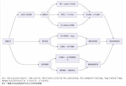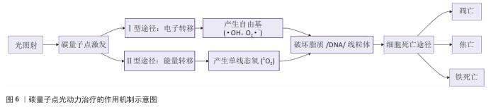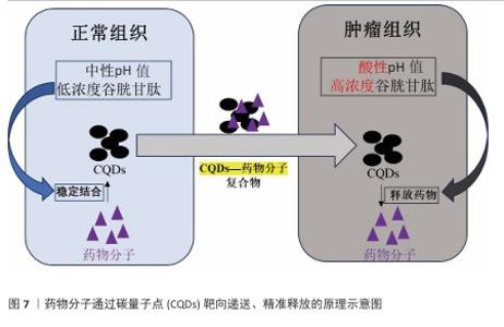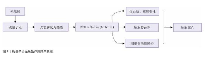 2.3 碳量子点在肿瘤诊疗中的主要应用方式 近年来,碳量子点凭借着优异的荧光特性、生物相容性和低毒性,在医学的领域展现出巨大潜力。碳量子点在肿瘤诊疗中的应用主要有荧光成像、光热治疗、光动力治疗、药物载体、免疫治疗等几种方式[63-64]。 2.3.1 荧光成像 荧光成像是碳量子点在肿瘤诊疗中的一项重要应用[65-66]。利用碳量子点的荧光特性,将它作为荧光探针标记肿瘤细胞或组织,实现对肿瘤的早期诊断和实时监测[67],或者通过碳量子点与肿瘤特异性抗体或配体结合可实现对肿瘤的靶向成像,用于肿瘤早期诊断[68],示意图见图4。 ALARFAJ等[18]合成的一种碳量子点携带CA19-9的特异性抗体,以检测胰腺癌的肿瘤标志物CA19-9,由于碳量子点的荧光特异性,在小鼠体内与CA19-9特异性结合以后能引发荧光信号的变化,通过检测荧光信号强弱便能实现对CA19-9的定量分析。HUANG等[20]合成了一种具有稳定荧光的碳量子点,将它与肝癌细胞Smmc-7721共同孵育,发现肝癌细胞Smmc-7721能将碳量子点有效摄取,在随后的小鼠实验中发现该碳量子点在3 h后出现在小鼠肝癌细胞中,在随后12,24 h的检测中几乎完全稳定富集在肝癌细胞中,检测到强烈的荧光信号,体现了碳量子点的特异性和低毒性。 2.3.2 光热治疗 当碳量子点受到特定波长的光照射时,它表面或内部的电子会从基态跃迁到激发态,随后电子通过非辐射复合将吸收的光能转换为热能,基于此特性,碳量子点可作为光热转换剂[69]。在光热治疗中,碳量子点作为光热剂将吸收的光能转化为热能,使局部温度升高(42-60 ℃)[70],由于肿瘤细胞对热的耐受性较差,蛋白质、核酸等生物大分子会发生变性、损伤,导致细胞膜破裂、细胞器功能障碍,最终导致死亡[71],见图5。由于碳量子点可进行表面修饰,使它具有肿瘤组织靶向能力,特异性地聚集在肿瘤组织中,实现对肿瘤的精准光热治疗,最大限度地减少对正常组织的损伤[72]。 BAO等[19]将合成的碳量子点与宫颈癌HeLa细胞共同孵育,发现碳量子点不影响HeLa细胞的活性,表现出低细胞毒性;将碳量子点注入肿瘤小鼠体内,在655 nm的激光照射下展现出59%的光热转换效率,肿瘤部位温度明显升高且肿瘤生长受到显著抑制,检测主要器官(心、肝、脾、肺和肾)均代谢良好,证明碳量子点的低毒性。LI等[73]制备的碳量子点能在808 nm激光照射下达到55.4%的光热转换率,以较低质量浓度(45 μg/mL)抑制小鼠体内的肿瘤。 2.3.3 光动力治疗 碳量子点能与光敏剂(能被光激活的分子或材料)结合,在特定波长的光照射下,光敏剂可通过电子转移或能量转移的方式产生自由基或单线态氧,进而产生活性氧簇[74],这些活性氧具有强氧化性,可以破坏肿瘤细胞的细胞膜、线粒体、DNA等生物大分子,导致细胞凋亡、焦亡或铁死亡。光动力治疗机制路线如图6所示[23,75-76]。 ZHU等[21]设计出携带有透明质酸、光敏剂Ce6的碳量子点,透明质酸的加入能增强了HeLa细胞中的Ⅰ型跨膜糖蛋白(CD44,增殖、分化、迁移、血管生成的关键蛋白)对碳量子点的摄取,Ce6的加入提高了活性氧产量,协同达到特异性抑制肿瘤细胞生长、促进凋亡的目的。WANG等[77]设计出单原子锰锚定的碳量子点,将它注入到人肝癌细胞HepG2和人脐静脉内皮细胞中,在488 nm激光照射下,单原子锰的锚定显著增强了碳量子点的荧光性,能增强光热和光动力治疗效果。 2.3.4 药物递送 碳量子点凭借优异的水溶性和生物相容性可以作为药物载体,它表面富含多种官能团,能更好地与药物分子结合[78],再将抗肿瘤药物靶向递送到肿瘤部位,减少药物在正常组织中的分布,降低不良反应[79]。 基于肿瘤微环境与正常组织的差异(如酸性pH值、高浓度谷胱甘肽等),碳量子点可通过静电相互作用实现药物的精准控释[80],见图7。 PAN等[22]将抗肿瘤药物奥沙利铂与碳量子点结合形成CQDs-Oxa缀合物,注入到携带肿瘤的小鼠体内后发现,CQDs-Oxa缀合物显著抑制了肿瘤生长,91.3%的肿瘤在6 d内得到治愈。RAEISPOUR等[81]制备了一种与抗肿瘤药物米托蒽醌结合的碳量子点形成CQD-MTX复合物,在pH=7.4的生理环境中,48 h内复合物中的米托蒽醌累积释放率为8%;但在pH=5.2的肿瘤微环境中,48 h内复合物中的米托蒽醌累积释放率增加到11%。 2.3.5 免疫治疗 碳量子点在免疫治疗中主要通过触发免疫原性细胞死亡、逆转免疫抑制微环境和协同免疫调节3种机制发挥作用[82-83]。 触发免疫原性细胞死亡:碳量子点通过光动力治疗产生活性氧,激活细胞焦亡通路,导致细胞膜穿孔并释放白细胞介素1β、白细胞介素18等促炎因子,募集树突状细胞并促进其成熟,进而激活细胞毒性T淋巴细胞,启动自身免疫治疗肿瘤[84]。CHENG等[23]构建的碳量子点能在白光下产生大量羟基自由基,通过活性氧-线粒体-caspase-3/GSDME通路轴诱导肿瘤细胞焦亡。传统碳量子点在合成后单线态氧的产率较低,一般小于10%[85-87],但加入重原子(如溴Br)后能通过重原子效应促进单线态氧的量子产生,从而诱发细胞膜脂质过氧化,消耗谷胱甘肽,抑制谷胱甘肽过氧化物酶4活性,最终诱导肿瘤细胞铁死亡[88]。LI等[25]在合成的碳量子点中引入溴原子,使材料在光照下单线态氧的产率提高3.2倍,诱导肿瘤细胞膜脂质过氧化,发生铁死亡。碳量子点介导光动力-光热联合治疗可促使肿瘤细胞钙网蛋白膜暴露、高迁移率族蛋白B1释放及ATP分泌,三者协同激活T细胞发生免疫应答[89]。GUO 等[90]在设计的