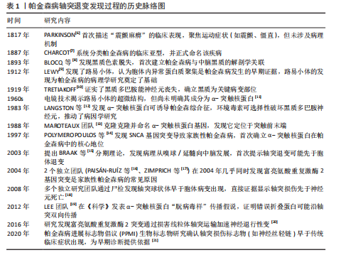 的研究并未涉及帕金森病病理机制的探索。1912年,LEWY[9]发现了路易小体,标志着帕金森病病理学研究的重大突破,为后续病理研究奠定了基础。接着,TRETIAKOFF[10]通过研究证实了黑质多巴胺能神经元的丧失,进一步确立了黑质作为帕金森病关键病变部位的地位。在后续研究中,MAROTEAUX及其团队[13]首先命名了α-突触核蛋白基因,并发现该蛋白定位于突触前末端,这一发现为理解帕金森病的分子机制提供了新的视角。BRAAK等[15]提出了帕金森病的分期理论,提出病理改变从嗅球/延髓向中脑发展,并首次提示轴突的退变可能早于神经元胞体的退变,这一理论的提出,引发了对帕金森病病理进展方式的新思考。随着研究的深入,多个独立研究团队通过尸检发现轴突的球状体病变早于神经元胞体病变,进一步提供了直接证据,显示轴突损伤可能先于神经元死亡。随之而来的是对轴突损伤病理机制的进一步探索,成为当前帕金森病研究的重要方向。基于以上研究历程,文章进一步对帕金森病中轴突相关的信号通路进行了全面综述,揭示了帕金森病病理学研究中的重要进展,并为未来的研究提供了理论支持。 2.2 帕金森病的病理机制 帕金森病是一种复杂的疾病,目前病因尚不明确,主要受遗传、环境以及老龄化因素影响。以往研究主要围绕神经元胞体内α-突触核蛋白聚集、氧化应激增加和细胞凋亡等因素展开。然而近年来的研究发现,帕金森病患者的神经元轴突常常先于胞体出现病理改变,并且这种变化在疾病的早期阶段便有所显现,这一发现使得针对轴突退行性变的帕金森病研究变得尤为关键。通过影像证据和尸检报告分析发现,帕金森病轴突退行事件大部分经历了蛋白质聚集、线粒体功能障碍、氧化应激、神经炎症等过程。 2.2.1 帕金森病早期中脑多巴胺能神经元轴突变性的影像学证据 在帕金森病初期症状的研究中,使用弥散张量成像和扩散加权磁共振成像技术发现了白质中广泛的轴突损伤[22]。影像学显示,帕金森病患者在T2加权或液体抑制反转恢复序列上出现显著的白质高信号,并且白质损伤的程度与帕金森病症状的严重性密切相关,白质损伤越严重,患者在运动、认知、执行和语言功能方面的损害也越显著[23]。这一变化与低温X射线纳米断层扫描结果一致,低温X射线纳米断层扫描结果揭示了帕金森病患者黑质轴突的肿胀和髓鞘缺陷[24],这种髓鞘脱失可能与α-突触核蛋白积聚引起"