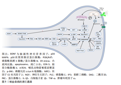 者的氧化应激状态,促进核因子E2相关因子2进入细胞核、增强DJ-1清除活性氧的能力、降低轴突内活性氧的含量,从而减轻轴突损伤[62]。 神经营养因子信号通路受损:神经营养因子如脑源性神经营养因子、神经生长因子[63]、神经营养素3和胶质细胞衍生神经营养因子[64],通过激活有丝分裂原活化蛋白激酶和磷脂酰肌醇3激酶/蛋白激酶B通路促进轴突生长、成熟和突触发育。研究表明,α-突触核蛋白过表达会下调脑源性神经营养因子的转录并损害它在轴突中的运输,导致脑源性神经营养因子表达减少并伴随活性氧增加,进而通过促凋亡蛋白Bax诱导轴突变性[65]。运动训练(如跑台运动)能够增加脑源性神经营养因子的表达,增强海马锥体神经元突触可塑性,有效减缓轴突损伤[66]。α-突触核蛋白还能够通过抑制RET转录因子核受体相关蛋白1的转录继而降低RET表达,最终加速轴突的丢失[67]。 (2)结构/功能修复:轴突损伤后的神经修复过程可按照一定的顺序进行:首先,细胞骨架的重建为神经元提供形态支持;接着,轴突再生通过信号通路促进神经纤维的恢复;最后,突触引导分子确保神经功能的精确恢复,这样的顺序保证了神经系统从结构基础到功能连接的逐步恢复。 细胞骨架重建功能下降:细胞骨架(如微管和微丝)的动态调控对轴突的生长和形态维持至关重要。许多研究表明,小GTP酶Rac1和细胞分裂控制蛋白42促进Rho GTP酶细胞骨架重组功能,而Ras同源家族成员A则起抑制作用,导致轴突和树突回缩以及棘和突触的丢失,因此,Ras同源家族成员A与小GTP酶Rac1/细胞分裂控制蛋白42之间表现出的拮抗关系能有效调节轴突的形态[68-69],而一旦这种关系失衡则有可能引发轴突损伤。小GTP酶Rac1的活化能促进α-突触核蛋白的自噬清除,从而缓解了帕金森病患者的神经病变,并提高了多巴胺能神经元的存活率。而Ras同源家族成员A对细胞骨架动力学的影响主要是通过其下游效应器Rho相关卷曲螺旋蛋白激酶的激活介导的,Rho相关卷曲螺旋蛋白激酶通过磷酸化作用抑制神经轴突的生长,使神经突收缩、棘和突触丢失并诱导神经元凋亡[70],因此,抑制Ras同源家族成员A信号传导可能是早期疾病干预的一种有前途的策略[71-72]。 轴突再生障碍:Wnt/β-连环蛋白、音猬因子和Notch等信号通路在轴突损伤后的再生过程中发挥重要作用。Wnt/β-连环蛋白信号通路激活会增加靶基因的转录,并与脑源性神经营养因子相互作用共同促进细胞的增殖、分化和轴突的生长。此外,音猬因子通路与Wnt/β-连环蛋白信号通路协同作用,激活下游靶基因,保护轴突免受氧化应激的影响,进一步促进轴突再生[73];相反,当Wnt/β-连环蛋白表达下降时,轴突的发育和再生受到影响,最终引发神经变性[74-75]。在帕金森病患者中,α-突触核蛋白的积累常伴随Notch1表达的下降,导致Notch信号在细胞迁移、形态变化、突触可塑性、神经元成熟和长时程增强等过程中的调节功能丧失,最终可能引发轴突损伤[76-77]。一项有氧运动动物实验证明,运动能显著提高Wnt/β-连环蛋白和Notch信号通路的表达、明显改善认知功能,提示运动可能作为一种潜在的治疗策略[78]。 轴突引导分子信号受损:Slit-Robo、肝配蛋白-促红细胞生成素肝细胞激酶、轴突导向因子-结直肠癌缺失蛋白/UNC5、信号素-Plexin/神经纤毛蛋白、整合素等信号通路能够促进生长锥的有效迁移[79-84]。Slit或Robo缺乏使Slit-Robo的引导作用减弱,轴突失去正常的生长导向并发生断裂。轴突损伤后,Robo4与肝配蛋白A1结合抑制了血管内皮生长因子诱导的血管生成,进一步加剧轴突的损伤[85]。随着轴突内α-突触核蛋白的积累,轴突导向因子1的表达逐渐减少,这一变化激活了细胞骨架重建通路,有助于修复受损的轴突;然而,若轴突导向因子1持续低表达且UNC5B缺乏其配体,将破坏生长锥的稳定性[86]。研究表明,Slit-Robo1排斥作用与结直肠癌缺失蛋白受体相互作用能够抑制轴突导向因子1的功能,这可能进一步加剧轴突修复的困难;使用静态牵伸技术能够显著降低Robo1和Robo2的表达,从而促进轴突的导向生长,这为轴突再生提供了新的潜在策略[87]。这一发现提示,合理设计和实施运动训练干预能够有效加速轴突的修复过程,促进神经功能的恢复。 (3)蛋白质的清除受损:轴突病变可通过多重机制加剧α-突触核蛋白的异常积聚及其病理传播。研究表明,轴突损伤会破坏α-突触核蛋白的正常降解途径,如泛素-蛋白酶体系统和自噬-溶酶体途径[88-90],其通过激活丝裂原活化蛋白激酶信号通路促进酪氨酸羟化酶的异常磷酸化和泛素化,进而加速α-突触核蛋白的异常聚集[88]。当蛋白酶体功能受损时,α-突触核蛋白的清除主要依赖于大自噬和伴侣介导自噬两种途径[90]。值得注意的是,自噬过程的调控涉及复杂的信号网络:一方面,神经营养因子(如脑源性神经营养因子)可通过激活磷脂酰肌醇3激酶/蛋白激酶B/哺乳动物雷帕霉素靶蛋白信号轴促进自噬发生[68];另一方面,内质网应激(由Ca2+超载、活性氧累积等因素诱发)可通过干扰素调节因子1自磷酸化激活c-Jun氨基末端激酶/p38丝裂原活化蛋白激酶通路,进而启动自噬程序。然而在病理条件下,持续的氧化应激和内质网应激会导致轴突自噬功能进行性衰退,最终引发不可逆的轴突损伤。当前的证据表明,免疫治疗可通过减缓轴突中的α-突触核蛋白传播来缓解病变:抗α-突触核蛋白单抗能够显著减