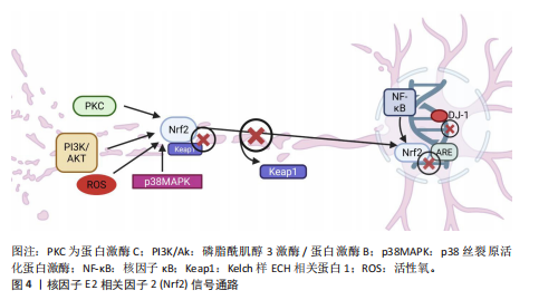 患者中,抗氧化应激的能力显著下降,导致氧化应激加剧并引发轴突变性,这一现象可能与核因子E2相关因子2 的核质穿梭失调密切相关。正常情况下,当氧化应激发生时,核因子E2相关因子2通路通过蛋白激酶C、磷脂酰肌醇3激酶/蛋白激酶B、p38丝裂原活化蛋白激酶和核因子κB等信号通路激活,从轴突中与细胞Kelch样ECH相关蛋白1解离,转入细胞核内并结合抗氧化反应元件,启动抗氧化酶的转录[56-57]。然而,在帕金森病患者的多巴胺能神经元轴突中,核因子E2相关因子2活性通常减弱或无法充分激活,导致抗氧化应激防御能力降低,见图4。DJ-1是核因子E2相关因子2下游通路中关键元件,能够通过清除轴突内的活性氧来保护线粒体免受氧化损伤,同时稳定核因子E2相关因子2,增强抗氧化防御;此外,DJ-1还能够抑制核因子κB途径,从而减轻炎症反应[58-59]。 DJ-1的缺乏对轴突的影响呈双向作用:轻度缺乏时,可能通过促进热休克蛋白水平的上升,抑制α-突触核蛋白的聚集;严重缺乏则会引发氧化应激加剧,线粒体形态改变,进而导致活性氧增多,并引发轴突损伤[60-61]。 研究证明,适量运动能够显著改善帕金森病患"