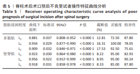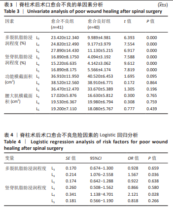 RESULTS AND CONCLUSION: (1) No significant differences were observed in baseline characteristics such as gender, age, or diabetes status between the poor healing group and the good healing group (P > 0.05). (2) There were significant differences in the functional cross-sectional area and fat infiltration percentage of the psoas major, erector spinae, and multifidus muscles between the poor healing group and the good healing group (P < 0.05). (3) Logistic regression analysis showed that the fat infiltration percentage was an independent risk factor for poor wound healing. (4) Receiver operating characteristic curve analysis showed that the fat infiltration percentage had a high predictive value for poor wound healing (area under the curve > 0.7). (5) One-way analysis of variance suggested that osteoporosis may be a risk factor for the degree of fatty infiltration of the L4 multifidus muscle (P < 0.05). (6) The results indicate that the percentage of fatty infiltration of the paraspinal muscles is an important indicator for predicting poor wound healing in patients undergoing traditional posterior open lumbar spine surgery, providing a clinical reference. Osteoporosis has also been shown to be a risk factor for the degree of fatty infiltration of the L4 multifidus muscle. However, due to the small sample size in this subgroup, further clinical trials are needed to confirm whether osteoporosis affects non-infectious poor wound healing after lumbar spine surgery.