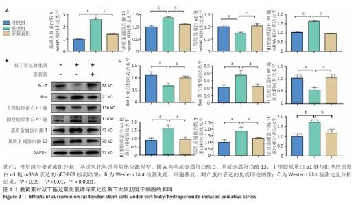 2.2 姜黄素提高大鼠肌腱干细胞的抗炎、抗氧化应激能力 肌腱损伤修复机制涉及炎症反应、细胞增殖及组织重塑3个阶段的级联生物学反应,值得注意的是,损伤微环境常存在血供障碍及炎性递质异常聚集现象。此次研究采用125 μmol/L叔丁基过氧化氢构建体外氧化应激模型,该浓度已在前人研究中证实可有效模拟肌腱干细胞的病理微环境[32-33]。 qRT-PCR检测显示,与对照组比较,模型组基质金属蛋白酶3、基质金属蛋白酶13、Ⅲ型胶原蛋白α1链mRNA表达升高,Ⅰ型胶原蛋白α1链mRNA表达降低,差异均有显著性意义;与模型组比较,姜黄素基质金属蛋白酶3、基质金属蛋白酶13、Ⅲ型胶原蛋白α1链mRNA表达降低,Ⅰ型胶原蛋白α1链mRNA表达升高,差异均有显著性意义,见图2A。 Western blot检测显示,与对照组比较,模型组基质金属蛋白酶3、基质金属蛋白酶13、Ⅲ型胶原蛋白α1链、Bax蛋白表达升高,Ⅰ型胶原蛋白α1链、Bcl-2蛋白表达降低,差异均有显著性意义;与模型组比较,姜黄素组基质金属蛋白酶3、基质金属蛋白酶13、Ⅲ型胶原蛋白α1链、Bax蛋白表达降低,Ⅰ型胶原蛋白α1链、Bcl-2蛋白表达升高,差异均有显著性意义,见图2B,C。 加入叔丁基过氧化氢造模后,一方面,炎症因子通过抑制Ⅰ型胶原转录影响正常胶原合成;另一方面,激活的蛋白酶加速细胞外基质降解,同时氧化应激可诱发肌腱干细胞凋亡级联反应;值得注意的是, Ⅲ型胶原虽在损伤早期发挥临时支架作用,但它的过量积累将导致组织力学性能下降。引入姜黄素干预后表现出显著调控作用:①有效抑制叔丁基过氧化氢诱导的炎性相关基质金属蛋白酶家族表达;②双向调节胶原代谢,恢复Ⅰ型胶原表达同时降低Ⅲ型胶原表达;③逆转凋亡相关蛋白表达失衡,提高抗凋亡蛋白Bcl-2的表达同时抑制促凋亡蛋白Bax表达,提示姜黄素可能通过多靶点调控维护肌腱干细胞的功能稳态。 "