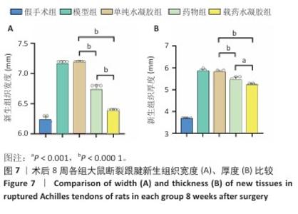 2.7 各组跟腱吻合端形态及腱周组织粘连度评定结果 此次研究构建SD大鼠跟腱离断模型,术后8周参照肌腱粘连分级标准对侧愈合组织进行形态学评估[30-31]。60只大鼠全部进入结果分析。术后8周取材时所有大鼠均未表现运动功能障碍,切口愈合良好无感染征象,未发生缝线反应及再断裂。大体观察显示,各造模组肌腱连续性恢复,可吸收缝线完全降解,模型组与单纯水凝胶组新生腱组织质地坚硬伴炎性增生,与周围组织致密粘连,分离需锐性操作;药物组及其载药水凝胶组织边界较清晰,钝性分离比例显著增加(表2)。各组粘连等级分布具有显著异质性(H=38.633,P < 0.001),值得注意的是,载药水凝胶组粘连等级分布与假手术组比较差异无显著性意义(P=0.283),显著优于其他造模组(P < 0.05)。 跟腱横断面测量显示,模型组、单纯水凝胶组右侧跟腱新生组织宽度、厚度高于假手术组,载药水凝胶组右侧跟腱新生组织宽度、厚度低于其他4组,差异均有显著性意义(图7)。结果表明,载姜黄素壳聚糖/β-甘油磷酸钠温敏水凝胶可显著减轻肌腱愈合过程中的瘢痕增生。 "