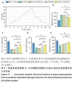 2.9 各组跟腱生物力学分析结果 跟腱组织拉力-位移曲线,如图9A所示。方差分析显示,各组间跟腱组织横截面参数存在显著差异(F=827.2,P < 0.001),载药水凝胶组跟腱组织横截面积低于模型组、单纯水凝胶组、药物组,差异有显著性意义,见图9B所示。载药水凝胶组跟腱组织拉伸最大应力与弹性模量均高于模型组、单纯水凝胶组、药物组,差异有显著性意义,见图9C,D所示。载药水凝胶组跟腱组织拉伸断裂伸长率大于模型组、单纯水凝胶组,差异有显著性意义,见图9E所示。值得注意的是,单纯水凝胶组与模型组跟腱组织弹性模量比较差异无显著性意义(P=0.90),提示单纯材料植入对组织刚度的改善有限,药物与水凝胶联合治疗组的优异力学表现证实姜黄素在提升组织抗拉强度、弹性恢复及延展性方面具有关键作用,进一步结合温敏水凝胶的缓释特性使修复组织的结构完整性显著提升,有效降低修复组织再断裂风险。"