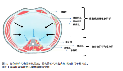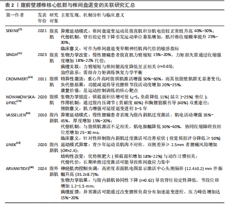 RESULTS AND CONCLUSION: There is a complex relationship between the lumbar core muscle groups and intervertebral disc degeneration. The transversus abdominis maintains lumbar stability by regulating intra-abdominal pressure and thoracolumbar fascia tension; its decompensation (inhibition/atrophy) is a key pathological feature of disc degeneration. Meanwhile, patients with disc degeneration exhibit characteristic synergistic dysfunctions in the core muscle groups: (1) Antagonistic compensation in the abdominal wall muscles (overactivation of the internal/external obliques to compensate for transversus abdominis dysfunction). (2) Dual compensation in the quadratus lumborum region (regional reorganization of psoas-quadratus lumborum synergy, interregional compensation between erector spinae and quadratus lumborum/psoas). (3) Gluteal muscle imbalance (fatty infiltration/inhibition of gluteus maximus, protective compensatory dominance of the gluteus medius on the dominant side). These synergistic dysfunctions are central to disrupting spinal stability and accelerating disc degeneration. Multi-muscle synergistic imbalance (e.g., disruption of the gluteal-lumbar-abdominal kinetic chain) not only exacerbates local mechanical abnormalities but also affects overall spine-pelvis biomechanical balance through systemic compensation and disrupts intra-abdominal pressure regulation. Molecular mechanism studies indicate that abnormal mechanical loading activates the Piezo1–Ca²⁺–F-actin–YAP signaling axis, promoting extracellular matrix degradation and inflammatory responses. Concurrently, imbalance in the nuclear factor E2-related factor 2/nuclear factor-κB pathway exacerbates oxidative stress and the inflammatory microenvironment, forming a vicious biomechanical-biological cycle. Intervention strategies targeting the restoration of synergistic core muscle function (e.g., transversus abdominis-targeted training, gluteal strengthening, and correction of abnormal activation patterns) and their combination with molecularly targeted drugs hold significant clinical potential. Future research should further investigate the mechanisms of interaction between muscle groups and compensation patterns to optimize the prevention and treatment of intervertebral disc degeneration.