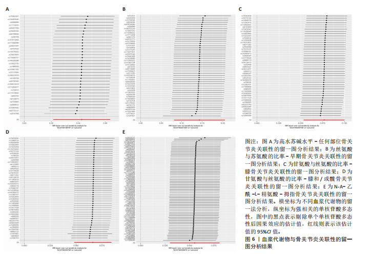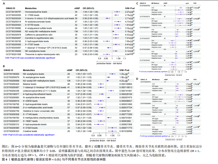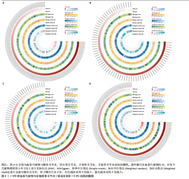 METHODS: A genome-wide association study of 1 400 metabolites was used as the exposure. Nine types of arthritis, namely any-site osteoarthritis, early osteoarthritis, knee and/or hip osteoarthritis, knee osteoarthritis, hip osteoarthritis, spinal osteoarthritis, finger osteoarthritis, hand osteoarthritis, and thumb osteoarthritis, were set as the outcomes. Single nucleotide polymorphisms were used as instrumental variables, and sensitive single nucleotide polymorphisms were selected for Mendelian randomization analysis. The inverse variance weighted method was used as the main analysis approach. Meanwhile, four methods, namely MR-Egger, weighted median, simple mode, and weighted mode, were employed for cross-validation. Sensitivity and pleiotropy tests were conducted using MR-PRESSO and Cochran’s Q test, and the obtained data were further corrected using the false discovery rate method.