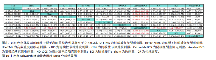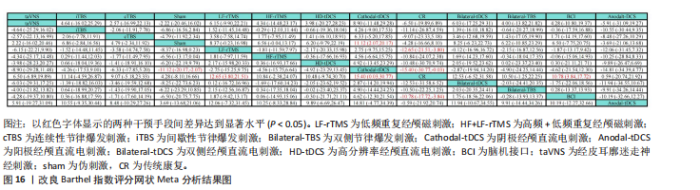 RESULTS: A total of 51 randomized controlled trials were included, covering 12 neuromodulation modalities. Network meta-analysis demonstrated that, compared with conventional rehabilitation, high-frequency repetitive transcranial magnetic stimulation yielded the greatest improvement in basic motor function recovery in the upper limb (MD=11.50, 95%CI: 6.83–16.16, P < 0.05). For upper limb functional utility and dexterity, continuous theta burst stimulation showed the most favorable effects (MD=12.10, 95%CI: 44.99–19.21, P < 0.05; MD=9.60, 95%CI: 1.32–17.88, P < 0.05). For daily living ability and spasticity, cathode transcranial direct current stimulation achieved the best outcomes (MD=15.40, 95%CI: 0.03–30.77, P < 0.05; MD=–0.83, 95%CI: –1.64 to –0.03, P < 0.05).
