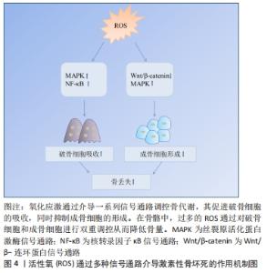 2.4.1 Wnt/β-catenin信号通路 Wnt/β-catenin信号通路又称为典型的Wnt信号通路,是一个进化保守的信号轴,参与细胞的分化、增殖和凋亡等生理过程[63],该信号通路参与调节成骨细胞和骨细胞[64-65]。在Wnt配体缺失的情况下,胞质β-catenin被磷酸化,磷酸化的β-catenin被蛋白酶体系统进一步泛素化并迅速降解,以防止在细胞质积累;Wnt配体存在时,细胞质中蓄积β-catenin,可易位到细胞核,与相关转录因子结合启动成骨细胞分化相关基因转录[63,66-69]。升高的活性氧通过转移β-catenin池,抑制成骨分化并导致骨细胞和成骨细胞凋亡增加[20,70]。此外,活性氧还可通过增强叉头盒O表达,减弱小鼠成骨细胞祖细胞中β-catenin转录,抑制Wnt/β-catenin信号通路,从而降低成骨细胞增殖,减弱骨形成[71]。这些研究提示,活性氧可通过直接或间接作用于Wnt/β-catenin信号通路,从而参与糖皮质激素诱导的骨缺血坏死。由此可见,活性氧通过介导Wnt/β-catenin信号通路,无论在细胞增殖、凋亡方面,还是结合骨组织工程应用上,对于治疗激素性股骨头坏死都具有十分重要的研究价值。 2.4.2 MAPK信号通路 MAPKs是丝氨酸-苏氨酸蛋白激酶的一个家族,其家族成员包括细胞外信号调节激酶(extracellular signal-regulated kinase,ERKs)、c-JunN端激酶(c-Jun N terminal kinase,JNKs)和p38 MAPKs,参与信号转导、细胞分化、增殖、凋亡和免疫应答等[72-73]。ERK和p38 MAPKs可磷酸化成骨细胞分化的主要调控因子RUNX2,从而促进成骨分化;而JNK在破骨细胞的凋亡、形成和分化中发挥着重要作用[74-75]。此外,MAPK/EPK信号通路参与间充质干细胞的增殖、存活及分化过程,激活该信号通路可促进细胞增殖,提高细胞活力[76],若该通路失活可阻断成骨细胞分化,促进间充质干细胞分化为脂肪细胞[77]。活性氧可以抑制MARK磷酸酶,从而提高MARK表达[41]。在原代成骨细胞和骨髓间充质干细胞中,过氧化氢通过刺激ERK1/2磷酸化,导致成骨细胞分化受损[78]。氧化应激还可通过激活JNK,p38和ERK1/2介导RANKL刺激的破骨细胞分化[79]。由此可见,氧化应激通过调节MAPK信号通路调节骨稳态,从而参与糖皮质激素诱导的骨坏死过程。 2.4.3 核转录因子κB信号通路 核转录因子κB由一系列转录因子组成,包括p65/RelA,RelB,cRel,p50和p52,在炎症、免疫、细胞增殖、分化和生存中发挥关键作用[80]。有研究发现,核转录因子κB信号通路的激活与糖皮质激素相关股骨头坏死密切相关[81]。核转录因子κB是一种重要的氧化还原敏感转录因子,可调节破骨细胞和成骨细胞,在骨形成和骨吸收中发挥重要作用[82],抑制核转录因子κB可导致骨形成增加和骨吸收减少[83]。RANKL是核转录因子κB信号通路的重要调控因子[84],其可通过诱导核转录因子κB活化,刺激破骨细胞标记基因的表达,从而促进破骨细胞前体细胞分化形成成熟的破骨细胞[83,85]。RANKL刺激破骨细胞产生活性氧,用抗氧化剂预处理破骨细胞可降低RANKL诱导的核转录因子κB的激活[86],表明RANKL通过活性氧诱导核转录因子κB活化促进破骨形成。活性氧还可通过激活核转录因子κB,促进破骨细胞形成和活性[87]。有研究发现,作为一种强抗氧化剂,硫辛酸可以通过抑制活性氧产生和核转录因子κB的活化,从而抑制RANKL诱导骨髓前体细胞中破骨细胞生成[88]。核转录因子κB活性主要由核因子κB抑制蛋白调控,活性氧通过核因子κB抑制蛋白α(NF-kappa-B inhibitor alpha,IKBα)磷酸化来激活核转录因子κB[89]。已有研究表明,谷胱甘肽过氧化物酶过表达导致活性氧水平下降,通过抑制IKB-α磷酸化,破坏磷酸化IKB-α的特异性蛋白水解,从而导致核转录因子κB激活[90]。综上所述,文章认为活性氧在核转录因子κB信号交流网络中,可通过传递RANKL来调节破骨细胞的生物活动,介导破骨生成,最终可能导致骨缺血坏死等疾病发生。 2.4.4 其他信号通路 除上述通路外,活性氧还可通过磷脂酰肌醇-4,5-二磷酸3-激酶/蛋白激酶B(Phosphatidylinositol-4,5-bisphosphate 3-kinase/protein kinase B,PI3K/AKT)、激活转录因子(Activating transcription factor,ATF)等信号通路参与激素型骨缺血坏死的过程[20,91]。例如,PI3K/AKT信号通路参与细胞增殖、分化、侵袭和凋亡等过程[92]。PI3K的激活导致AKT的磷酸化和激活,AKT通过增强抗凋亡蛋白的表达和抑制促凋亡蛋白的活性来促进细胞存活[93]。激活PI3K/AKT信号通路是大鼠成骨细胞增殖分化的必要条件[94],通过使用具有较强抗氧化活性的四甲基吡嗪预处理,FANG等[95]发现其促进骨髓间充质干细胞中p-AKT的表达。这证明PI3K/AKT信号通路参与了四甲基吡嗪对抗氧化应激诱导的骨髓间充质干细胞凋亡。CHEN等[96]也指出,ATF-3在刺激活性氧产生后,促进了小鼠成骨细胞中RANKL基因表达增加。由此可知,无论是体内还是体外实验,皆证实了在氧化应激的条件下,许多关键通路参与骨细胞的增殖、分化和凋亡。每种途径都代表一种潜在的治疗方法,可通过这些信号通路进一步研究设计防止骨丢失的抗氧化策略。 2.5 氧化应激与骨形成 2.5.1 活性氧对骨形成的影响 活性氧不仅可以通过诱导氧化应激直接作用于骨髓间充质干细胞、骨细胞和成骨细胞,损害其抗氧化防御系统,还可以通过介导Wnt/β-catenin、MAPK和PI3K/AKT信号通路抑制骨形成:①活性氧增加可诱导MAPK磷酸化,导致成骨细胞功能受损;②活性氧可通过减弱成骨细胞中β-catenin转录,抑制Wnt/β-catenin信号通路,从而减弱骨形成;③PI3K的激活导致AKT磷酸化和激活,AKT通过