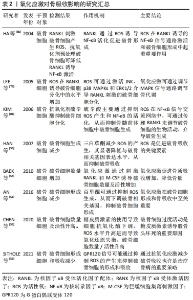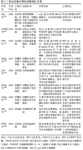 2.5.2 活性氧与骨吸收的关系 活性氧可通过促进破骨细胞的形成和增加破骨细胞活性来调节骨吸收:①RANKL与RANK相互作用可刺激破骨细胞的分化及活性,过量的活性氧可通过上调RANKL的表达促进骨吸收;②RANKL是核转录因子κB信号通路的重要调控因子,其可通过活性氧诱导核转录因子κB活化,刺激破骨细胞标记基因的表达,从而促进破骨细胞分化成熟;③氧化应激通过调节MAPK信号通路调节骨代谢,其可通过激活JNK、p38 MAPKs和ERK1/2介导RANKL刺激的破骨细胞分化;④活性氧水平增高导致氧化还原失衡,破骨细胞形成及活性增加;使用抗氧化药物下调活性氧水平,可抑制破骨细胞形成,减少骨吸收。氧化应激对骨吸收影响汇总表,见表2。"