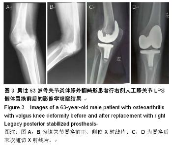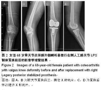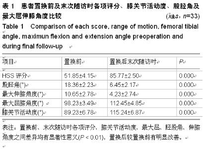 knees). Parapatellar medial approach was used. Precise osteotomy was utilized to correct limb alignment. Lateral soft tissue received selective release. Finally, an equal type of Legacy posterior stabilized prosthesis (Zimmer, USA) was implanted and fixed with antibiotic bone cement. The differences in hospital for special surgery knee score, range of motion of knee, femoral tibial angle, and maximum flexion and extension angle, as well as X-ray film results were compared and analyzed before and after replacement. The complications including deep vein thrombosis, peri-prosthetic infection, patellar clicking, unstable knee, and common peroneal nerve injury were recorded after surgery.