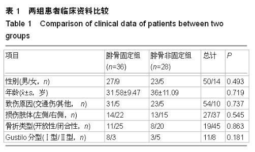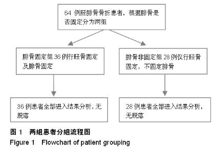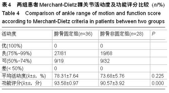 METHODS: A retrospective review has been performed on the clinical data of sixty-four cases with distal third tibia shaft fracture in Department of Orthopedics, China National Offshore Oil Corporation General Hospital from January 2006 to March 2010. All cases were divided into two groups based on whether the fibula was fixed or not: fibula fixation group (n=36) and fibula non-fixation group (n=28). Union rate of fracture, bone union time and tibial valgus angle were compared between the two groups. According to Merchant-Dietz criteria, the ankle range of motion and ankle evaluation score were evaluated and compared between the two groups.